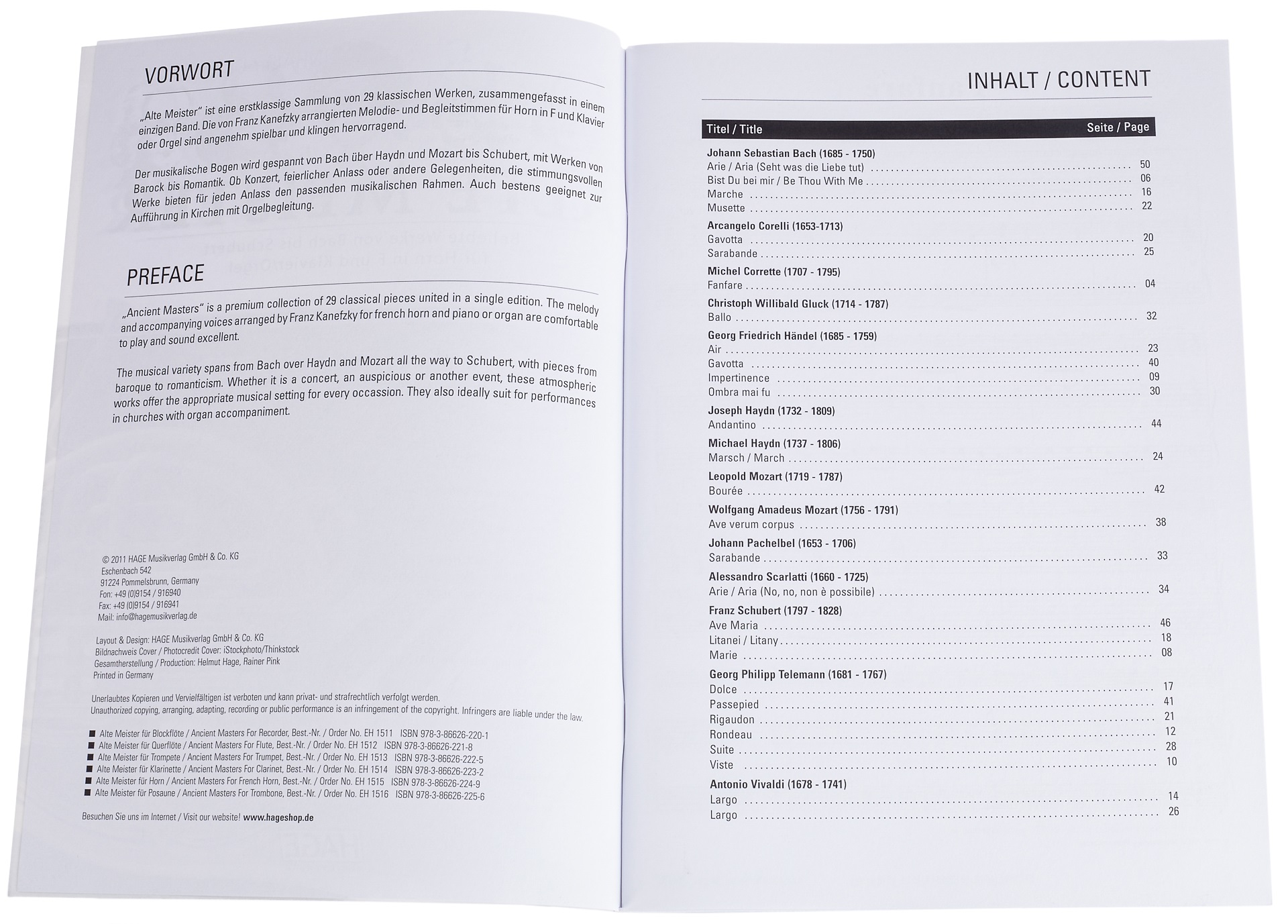 Noty pre lesný roh Ancient Masters obsahuje 29 známych skladieb klasickej hudby (obdobie baroka, klasicizmu a raného romantizmu) od takých hudobných velikánov, ako sú Bach, Haydn, Vivaldi, Mozart, Schubert a ďalší, v úprave pre sólový lesný roh so sprievodom pre klavír/organ. Zoznam skladateľov a skladieb: – Johann Sebastian Bach (1685 – 1750): Arie / Ária (Seht was die Liebe tut), Bist Du bei mir / Buď so mnou, Marche, Musette – Arcangelo Corelli (1653-1713): Gavota, Sarabanda – Michel Corrette (1707-1795)