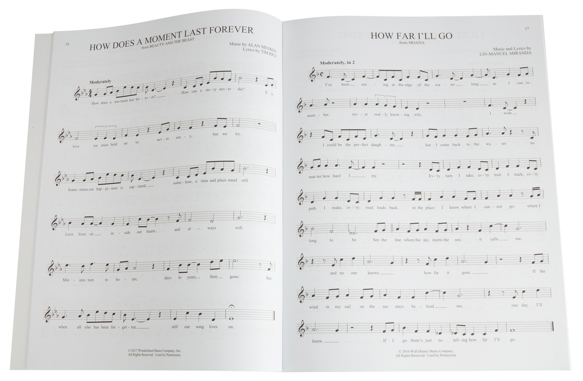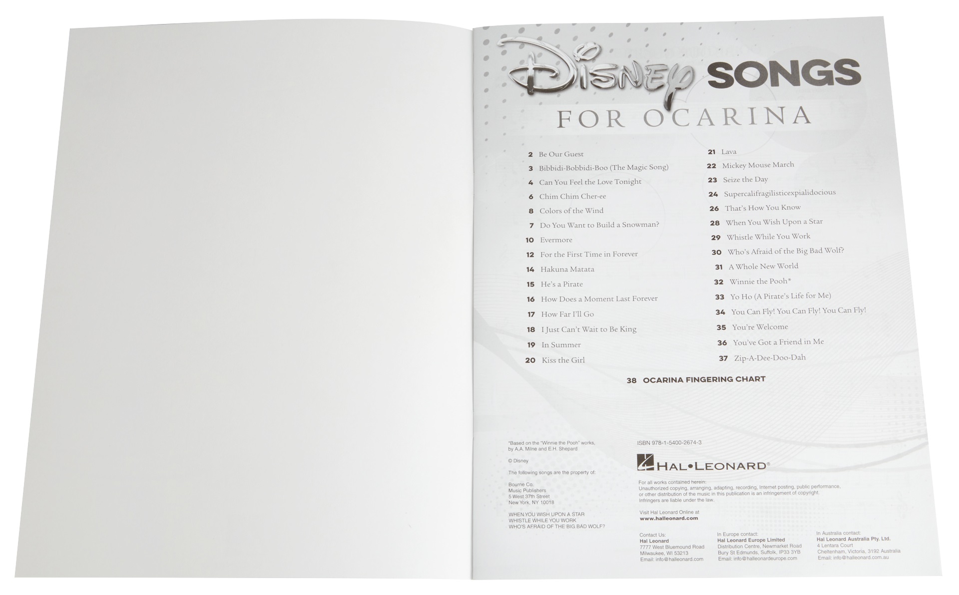 Noty pre fúkaciu harmoniku Táto publikácia obsahuje tridsať známych melódií z Disneyho filmov v úprave pre okarínu s desiatimi, jedenástimi alebo dvanástimi otvormi. Skladby sú uvedené v notovom zápise spolu s textom. Zoznam piesní: – Úplne nový svet (Aladin) – Buď naším hosťom (Kráska a zviera) – Bibbidi-bobbidi-boo (Čarovná pieseň) (Popoluška) – Can You Feel The Love Tonight (Leví kráľ) – Chim Chim Cher-ee (Mary Poppins) – Farby vetra (Pocahontas) – Chcete postaviť snehuliaka? (Mrazené) – Evermore (Kráska