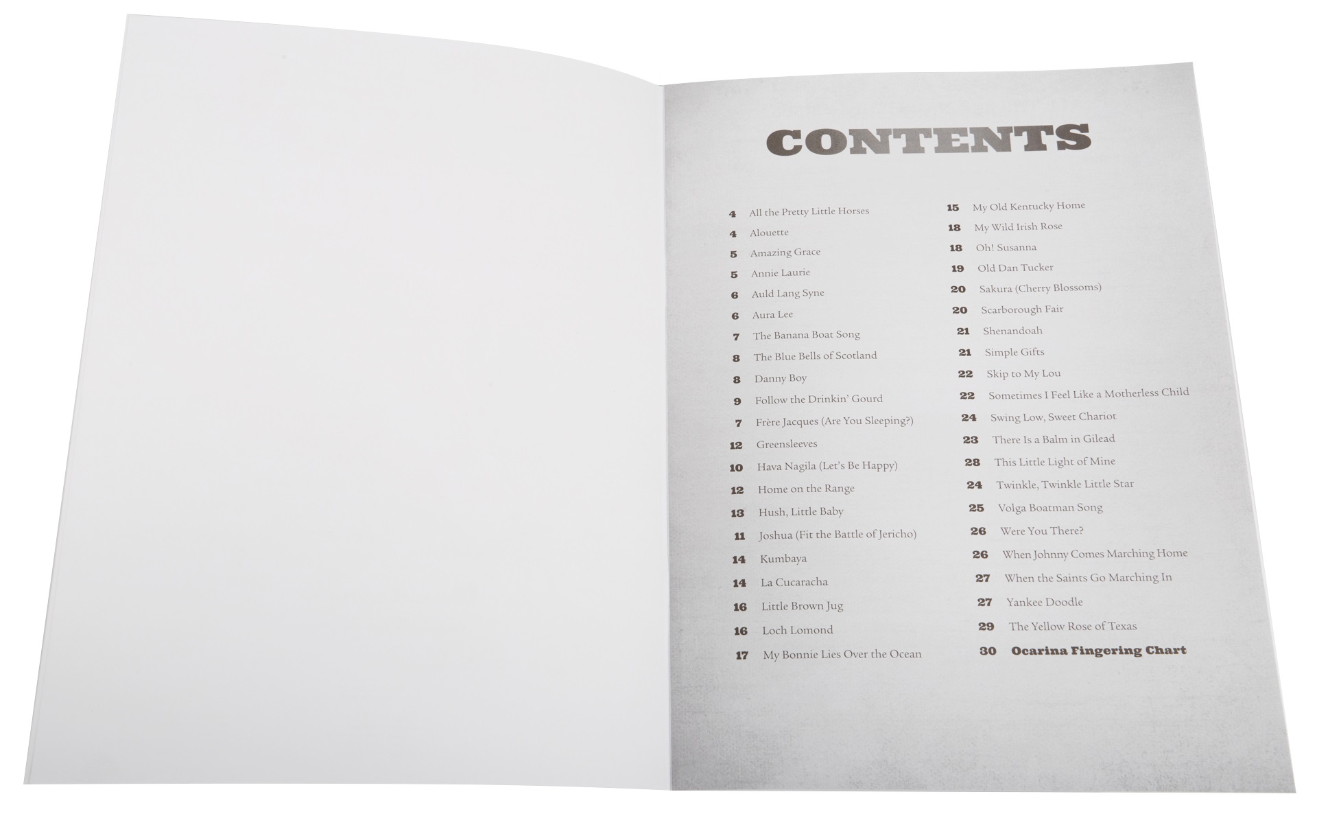 Noty pre fúkaciu harmoniku Táto publikácia obsahuje štyridsať ľudových piesní v úprave pre okarínu s desiatimi, jedenástimi alebo dvanástimi otvormi. Skladby sú uvedené v notovom zápise spolu s textami. Zoznam piesní: Všetky krásne malé kone Alouette Úžasná milosť Annie Laurie Auld Lang Syne Aura Lee Danny Boy Sledujte The Drinkin' Gourd Frere Jacques (Spíš?) Greensleeves Hava Nagila (Buďme šťastní) Domov na dosah Hush, Little Baby Jozue (Zapojte sa do bitky pri Jerichu) Kumbaya La Cucaracha Malý hnedý džbá