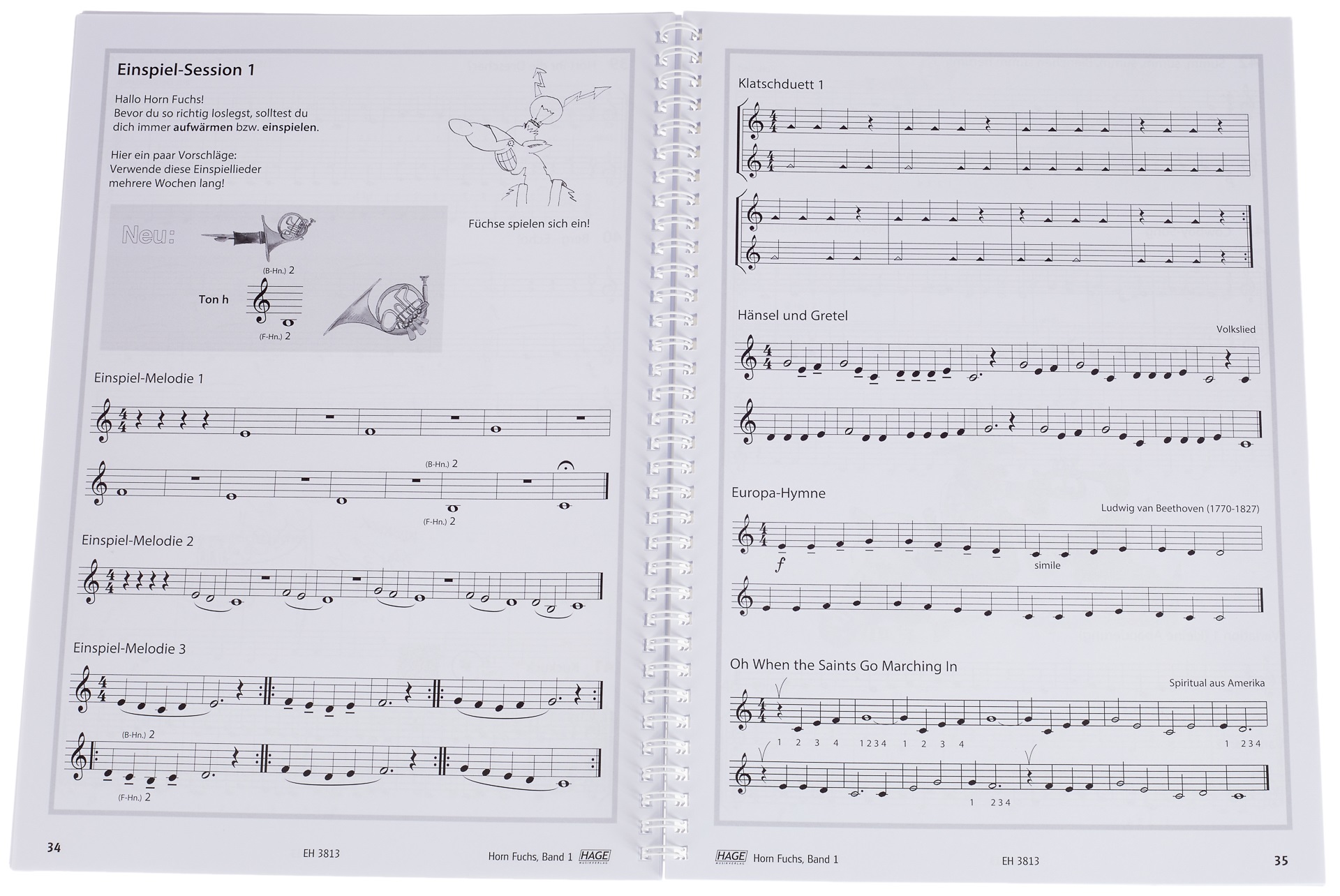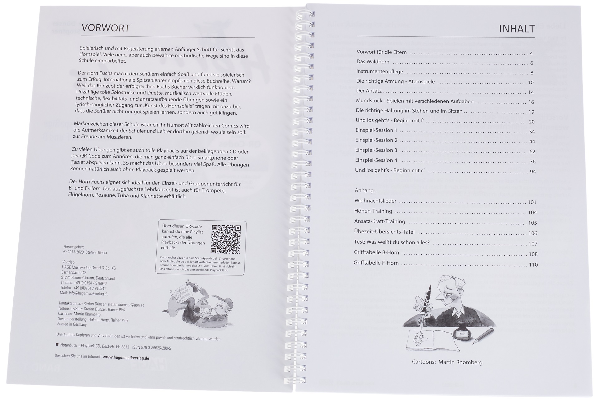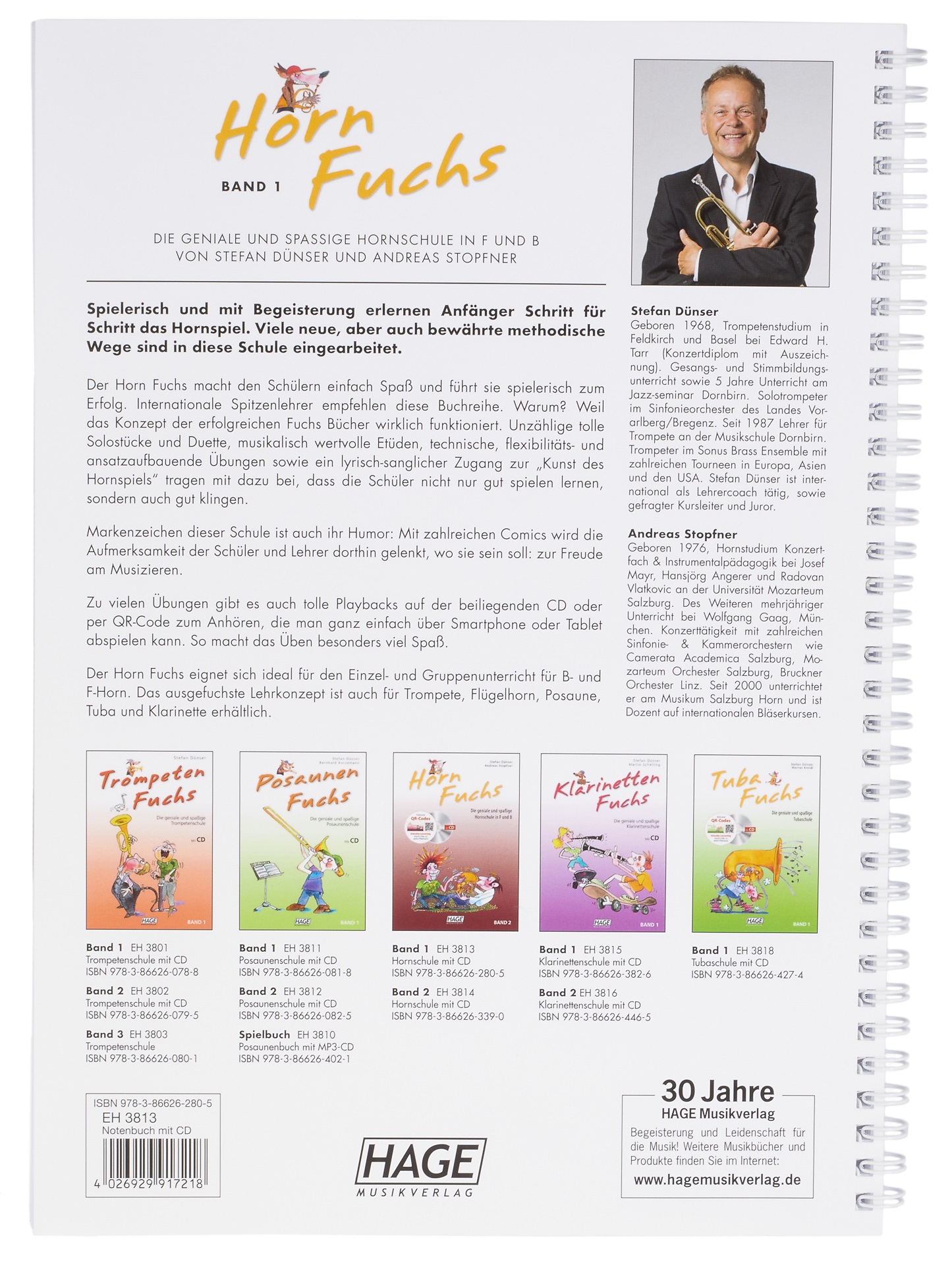 Škola hry na lesný roh Horn Fuchs 1 je prvý diel školy hry na lesný roh (Bb a F), ktorý je vhodný na individuálne hodiny a pre hudobné školy. Kniha ponúka širokú škálu skladieb pre sólový nástroj a duetá, ako aj hudobné etudy a cvičenia na precvičenie techniky. Neoddeliteľnou súčasťou kníh je primeraná dávka humoru, pretože hra na hudobný nástroj, či už pre dospelého alebo dieťa, by mala byť predovšetkým zábavou. Priložené audio CD obsahuje sprievodné nahrávky k mnohým cvičeniam (prístupné aj prostredníctvo