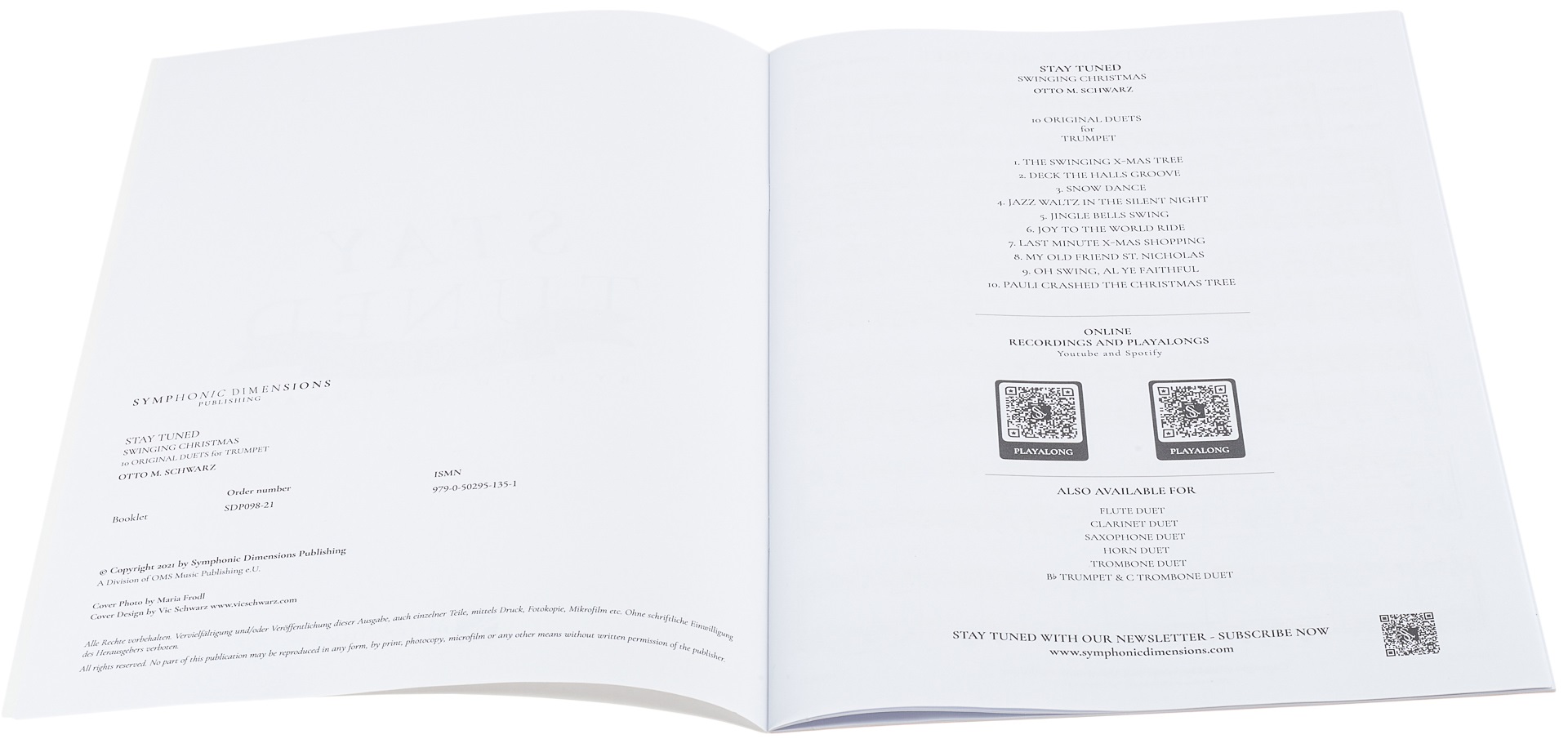 Noty pre trúbku Publikácia Thomas Gansch: Stay Tuned – Swinging Christmas je ďalším výsledkom spolupráce so špičkovým rakúskym trubkárom Thomasom Ganschom, známym zo skupiny Mnozil Brass. Veselé swingujúce vianočné duety vám spríjemnia nielen vianočné sviatky. Nahrávky skladieb sú k dispozícii na youtube kanáli vydavateľstva (Symphonic Dimensions Publishing). Zoznam skladieb: – 1. Hojdací stromček [Otto M. Schwarz] – 2. Deck the Halls Groove [Otto M. Schwarz] 2. – 3. Snehový tanec [Otto M. Schwarz] – 4. Jaz