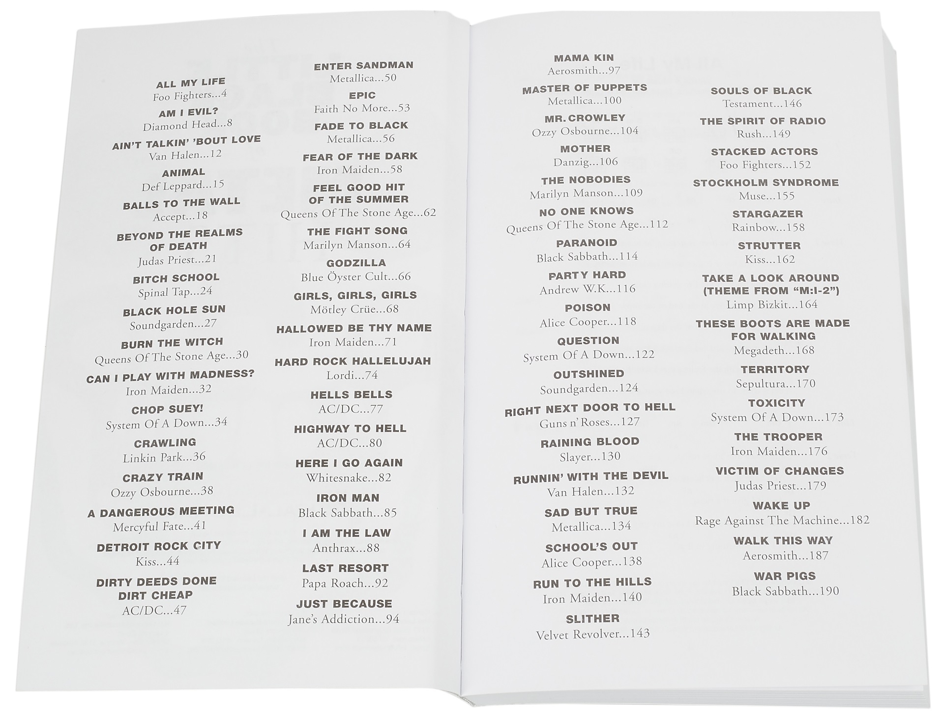 Spevník MALÁ ČIERNA KNIHA: KOV Knihy z edície The Little Black Book sú spevníky, ktoré obsahujú texty a akordové značky, a preto ich najviac ocenia gitaristi. Tento zväzok je venovaný rockovým a metalovým hitom. Zoznam skladieb: Nebezpečné stretnutie [Mercyful Fate] Ain't Talkin' 'Bout Love [Van Halen] Celý môj život [Foo Fighters] Som zlý? [Diamond Head] Zviera [Def Leppard] Gule na stenu [Prijať] Beyond The Realms Of Death [Judas Priest] Bitch School [Spinal Tap] Black Hole Sun [Soundgarden] Burn The Witc