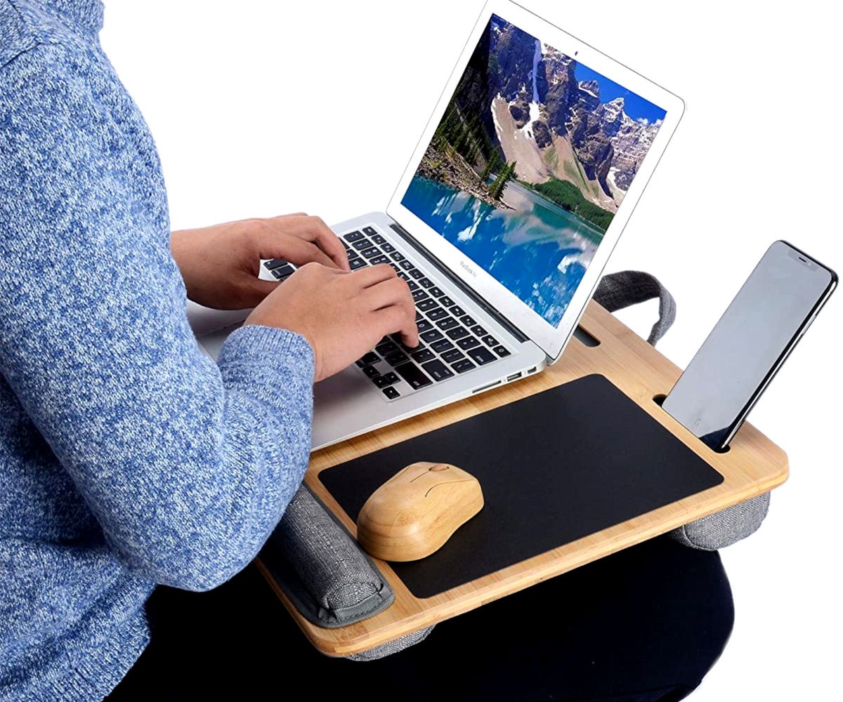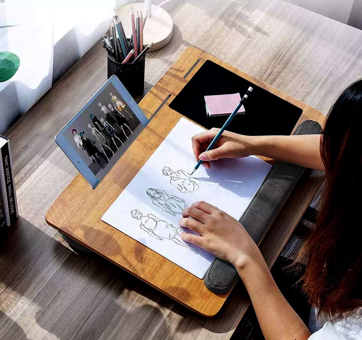 Stojan na notebook Univerzálna bambusová pracovná podložka vhodná pre módnych návrhárov, grafikov a ďalších kreatívcov, ktorí potrebujú maximálne pohodlie pri práci. Zadná strana má mäkké polstrovanie s protišmykovým povrchom a rovnaké polstrovanie nájdete aj v prednej časti pre lakte. Predná strana obsahuje aj dva výrezy na tablet alebo smartfón a protišmykovú podložku pod myš.