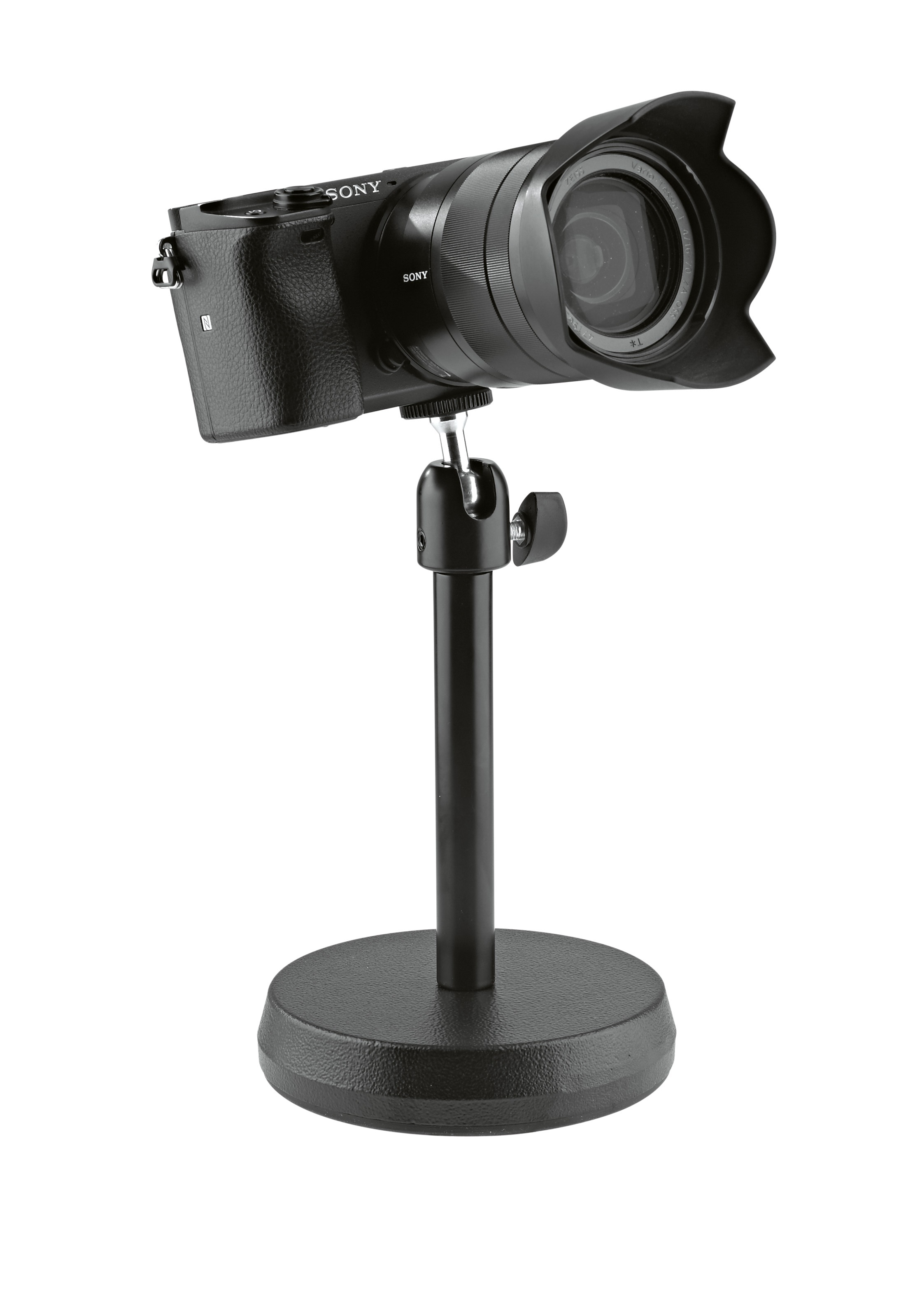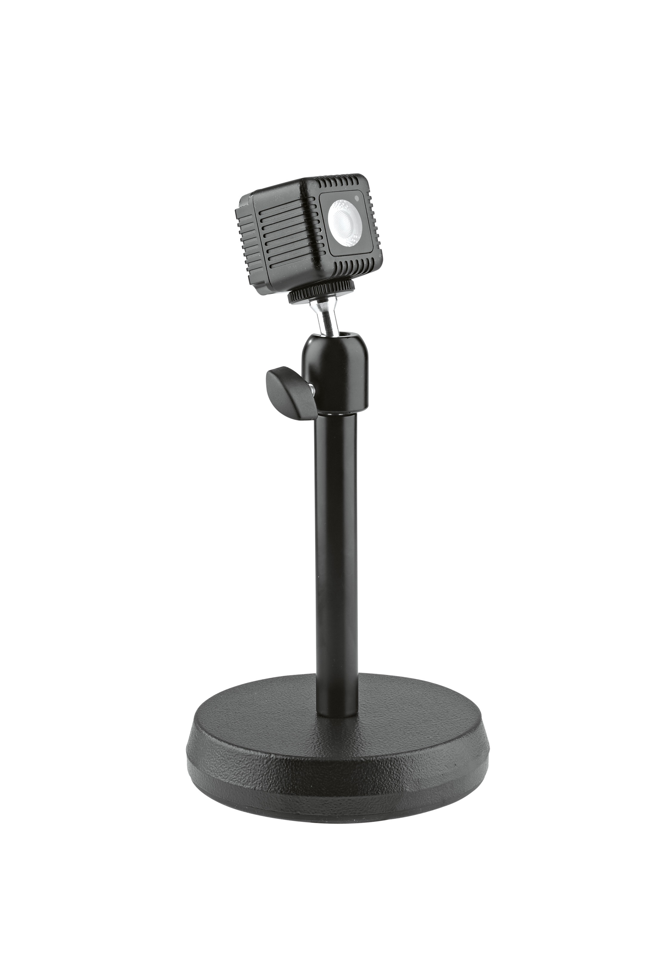Držiak na kameru Univerzálny stolový stojan na fotoaparát, diktafón, držiak na smartfón a iné AV zariadenia. Stojan má robustnú okrúhlu základňu a ?" závit na pripevnenie zariadenia alebo iného príslušenstva. Závit je pripojený k otočnému kĺbu, ktorý umožňuje meniť sklon v rozsahu 0 – 90 stupňov.