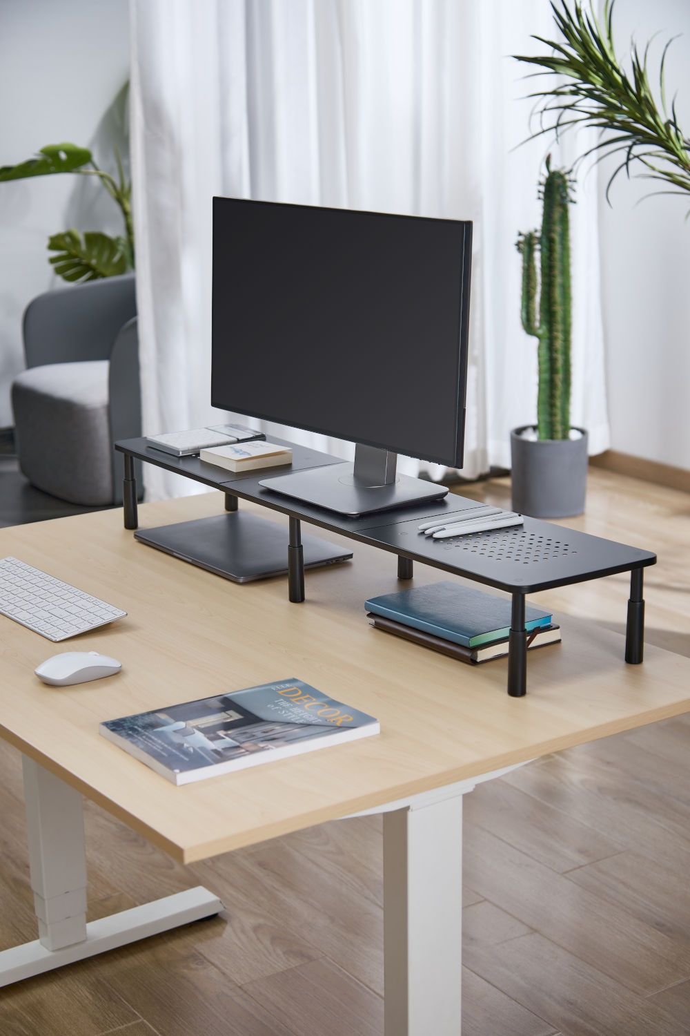 Stojan pre monitor Potrebujete riešenie na udržanie organizovaného a efektívneho pracovného priestoru? Mozos SPM2 je moderný stojan určený pre dva monitory alebo iné zariadenia, ktorý v sebe spája elegantný dizajn, vysokú praktickosť a premyslené funkcie. Kľúčové vlastnosti > dostatok priestoru pre dva monitory – široká plocha stojana je ideálna na prácu s dvoma monitormi, čo ocenia najmä profesionáli, hráči a kreatívci > ergonomický dizajn – vyvýšení