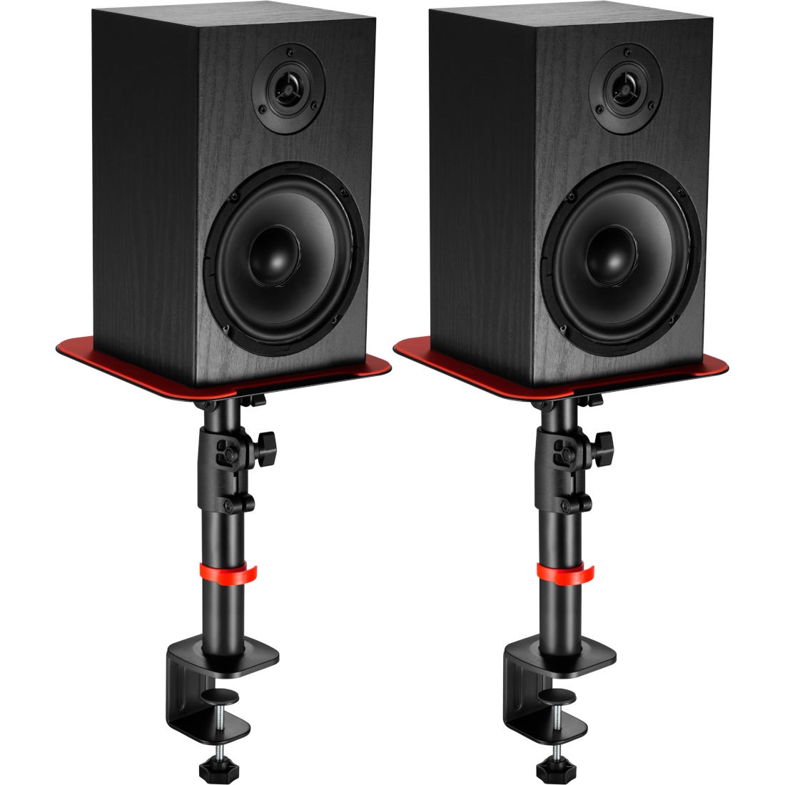 Stojan na štúdiové monitory Robustný výškovo nastaviteľný stojan vhodný pre štúdiové monitory a reproduktory. Je vyrobený z odolnej ocele a má závitovú skrutku na pripevnenie k doske stola vysokej až 62 mm. Na stojan môžete namontovať väčšinu monitorov na trhu, takže je vhodný do nahrávacích štúdií, ale oceníte ho aj v domácom kine, skúšobni alebo kancelárii.