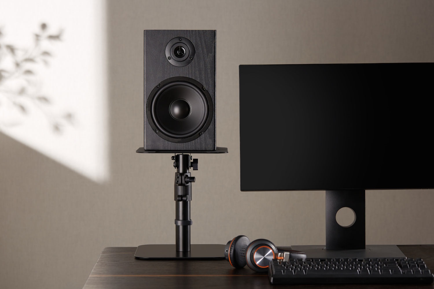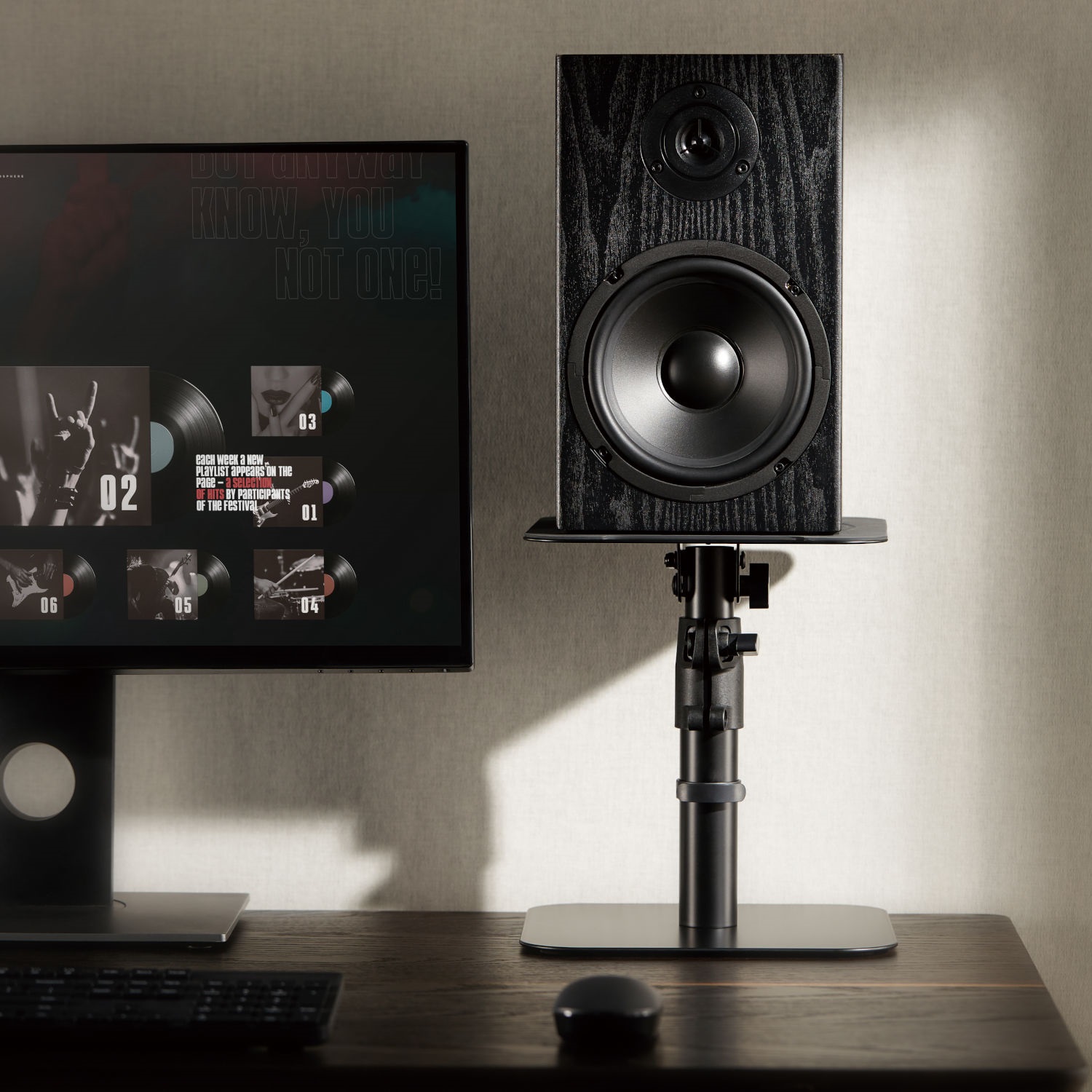Stojan na štúdiové monitory Mozos MSK6 je dvojica nastaviteľných stolových stojanov pre štúdiové monitory, ktoré sa vám určite budú hodiť, ak nemáte možnosť použiť v štúdiu bežné podlahové stojany alebo potrebujete jednoduché riešenie na umiestnenie ďalšieho páru reproduktorov. Správne nastavenie reproduktorov je jedným z najdôležitejších parametrov pri budovaní posluchového priestoru v štúdiu, ale aj doma. Ich umiestnenie priamo na stôl spôsobuje nežiaduce rezonancie, ktorých je ťažké sa z