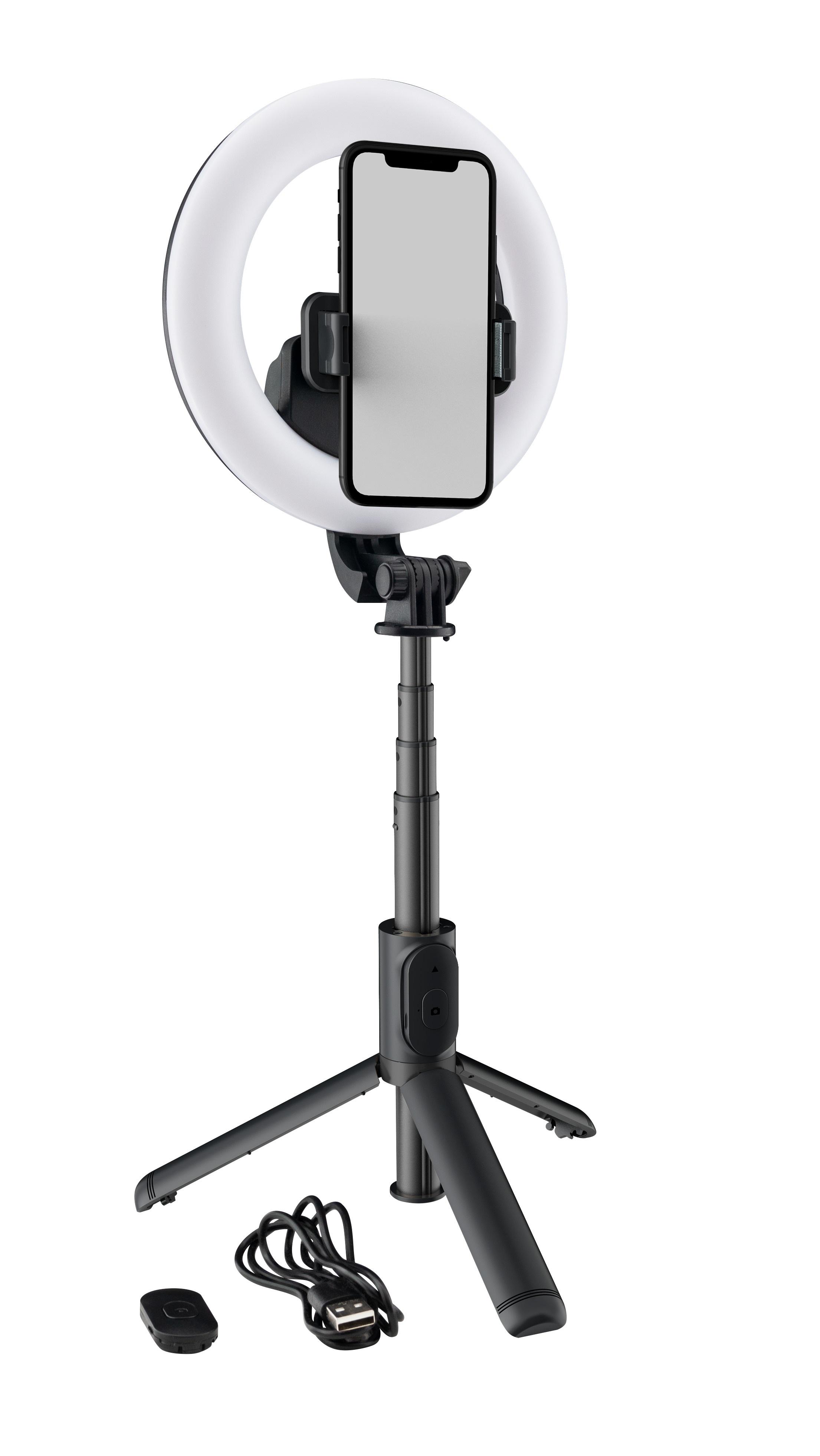 Mobilná filmová sada Kompaktná súprava príslušenstva vhodná na natáčanie videí, podcastov a vlogov, ktorá obsahuje svetelný prstenec LED s priemerom 6" a integrovanou batériou, teleskopickú selfie tyč s možnosťou rozloženia na statív, vstavaný držiak na mobilný telefón s možnosťou otáčania o 360° a diaľkové ovládanie na ovládanie svetla na väčšiu vzdialenosť. S touto sadou získajú vaše videá profesionálnu kvalitu a noví diváci sa len pohrnú. Batériu môžete nabíjať pomocou priloženého kábla USB.