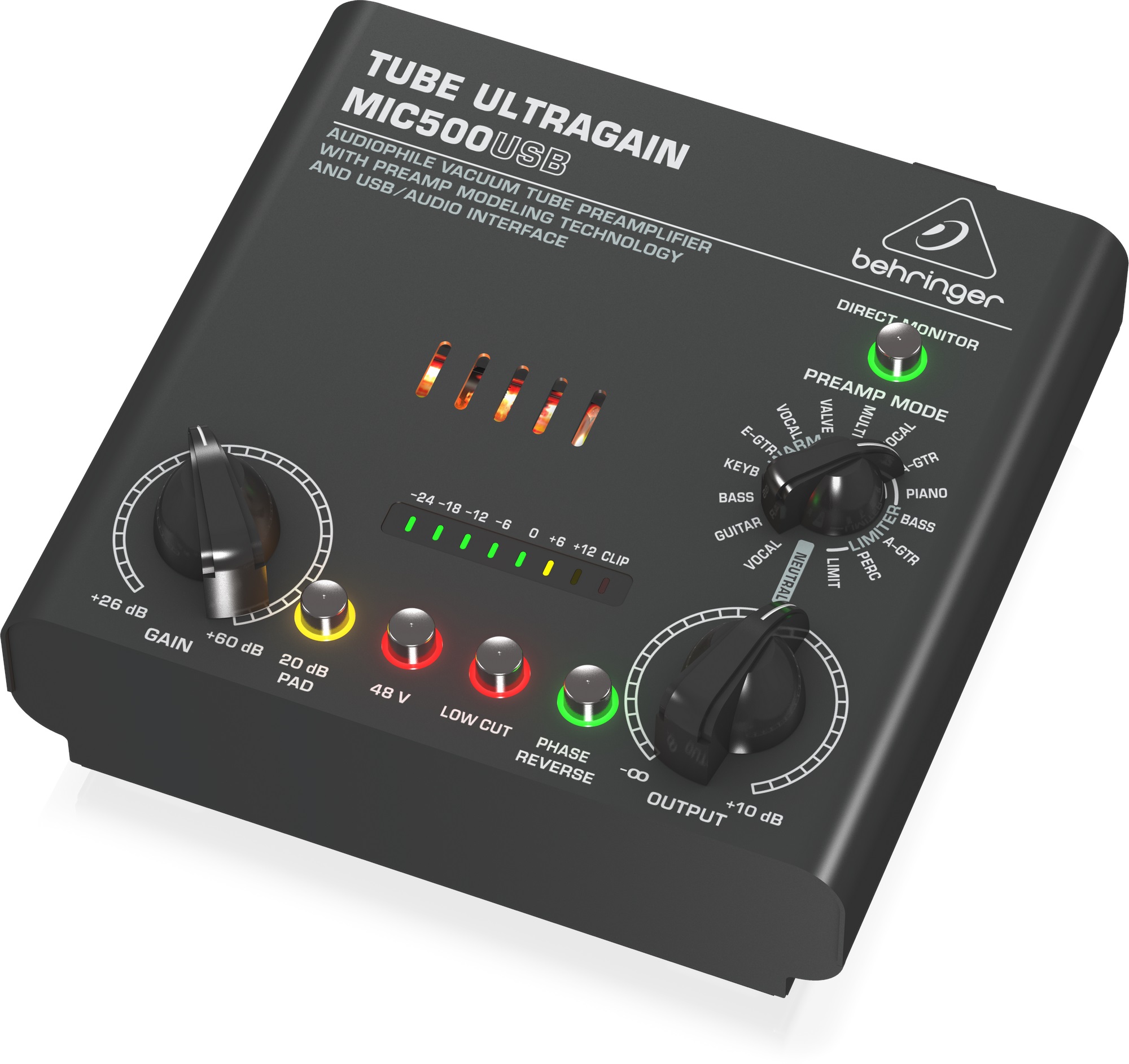 Mikrofónny predzosilňovač Behringer TUBE ULTRAGAIN MIC500USB je kombináciou dvojkanálového zvukového rozhrania a lampového mikrofónového predzosilňovača, ktorý alternatívne slúži ako nástrojový vstup HiZ. Lampy dokážu pridať signálu harmonické frekvencie, čím mu dodajú hĺbku a charakter. Hoci túto technológiu nahradili tranzistory, mnohí hudobníci sa zhodujú, že elektrónky poskytujú oveľa lepší zvuk. Ručne vybraná lampa 12AX7 dodáva vašim v