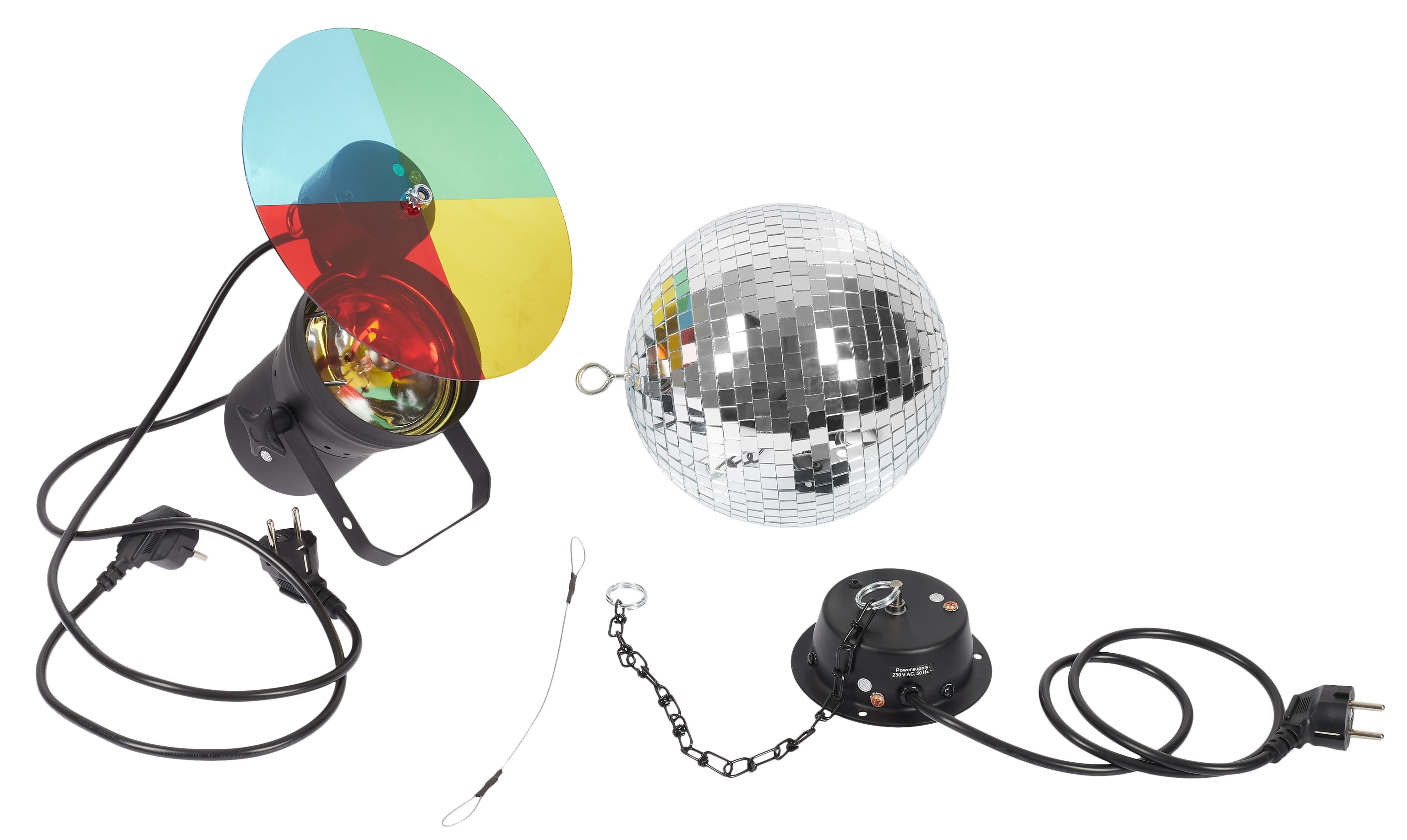 Zrkadlová guľa Táto súprava od spoločnosti Eurolite obsahuje všetko, čo budete potrebovať na roztočenie a rozsvietenie diskotékovej gule. V súprave nájdete zrkadlovú guľu s priemerom 20 cm, výkonný motor, ktorý zabezpečuje stabilné otáčanie 1,5 otáčky za minútu, a malý reflektor Eurolite PAR 36 T s integrovaným meničom farieb. S týmto vybavením budete môcť vytvoriť magický svetelný efekt, ktorý oživí každú udalosť a farebne rozžiari celú miestnosť.