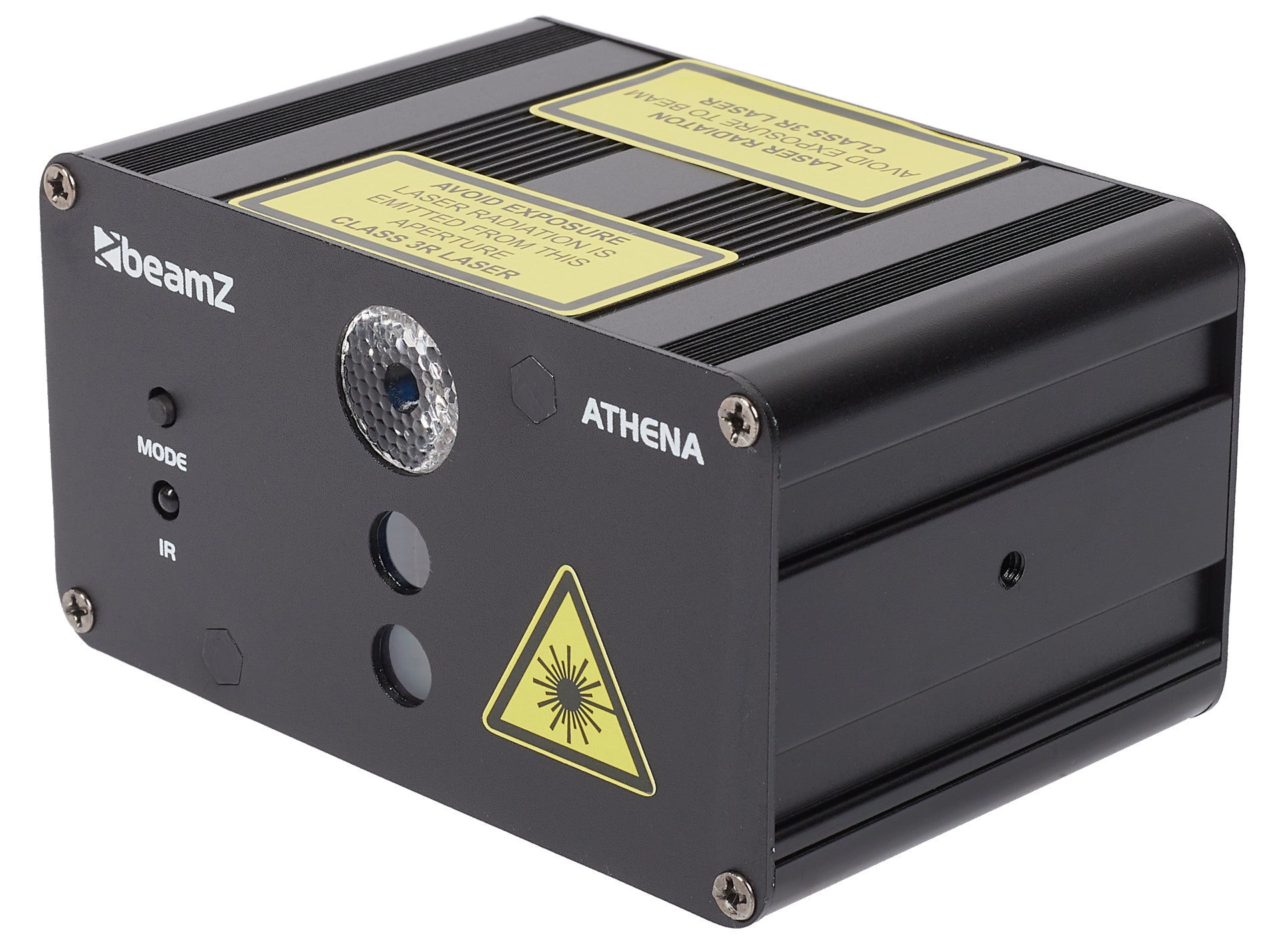 Laser Laserový systém Athena RG Gobo od spoločnosti BeamZ je veľmi kompaktné zariadenie napájané z batérie, ktoré si môžete vziať kamkoľvek so sebou bez toho, aby ste sa museli spoliehať na prítomnosť elektrickej zásuvky. S hmotnosťou 0,35 kg je ideálnym mobilným zariadením na domáce párty, menšie kluby a špeciálne podujatia. Jeho základom sú dva lasery – jeden červený s výkonom 100 mW a jeden zelený s výkonom 50 mW. K dispozícii je aj LED osvetlenie s paletou farieb RGB a