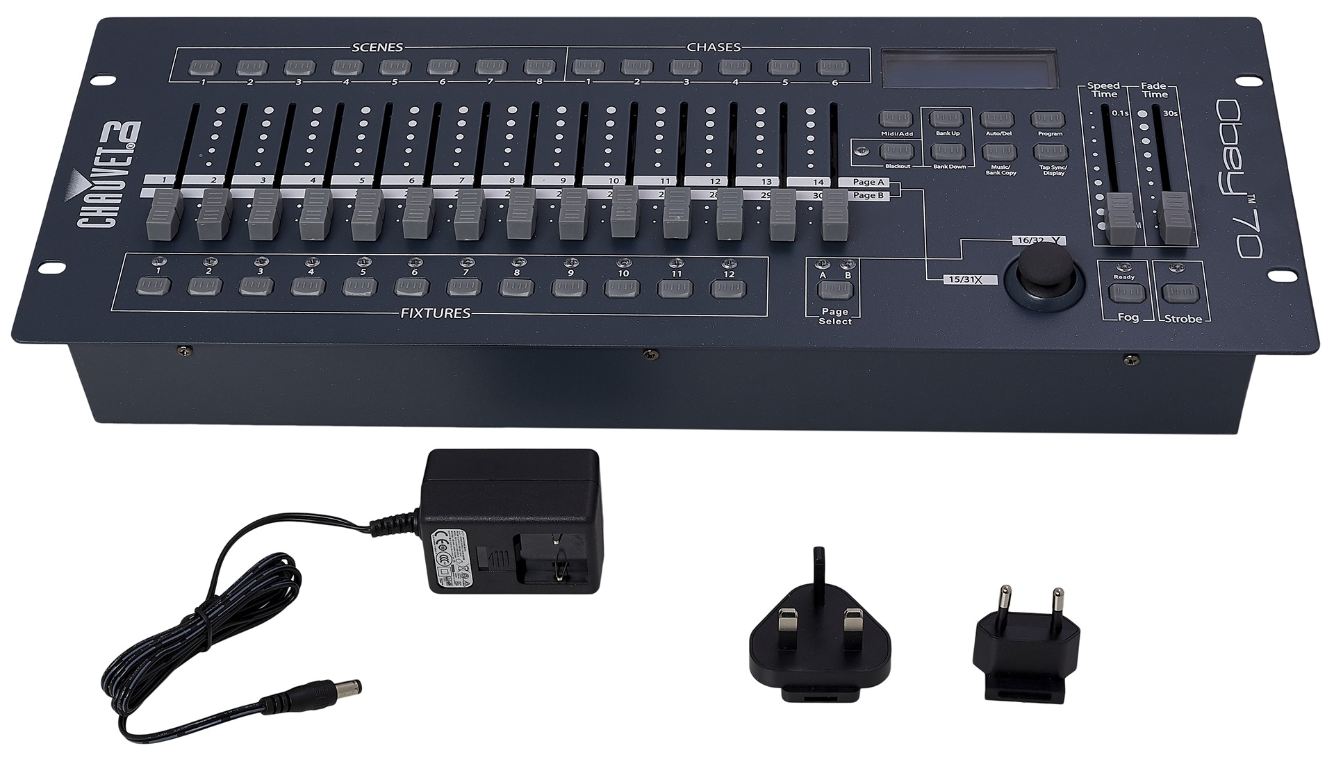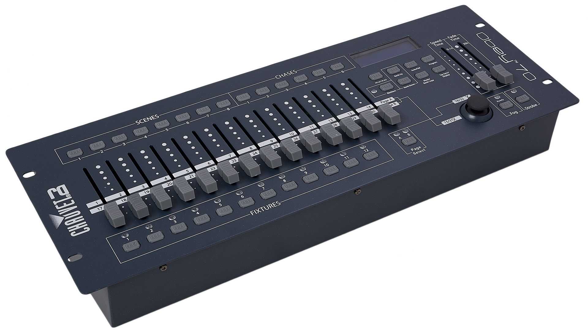 DMX kontrolér Obey 70 od spoločnosti Chauvet DJ je profesionálny DMX kontrolér, ktorý ponúka zlatú strednú cestu medzi rozsiahlymi možnosťami ovládania a kompaktnými rozmermi. Ide o 19" rackový kontrolér, ktorý zaberá celkovo štyri jednotky (4U). Zariadenie umožňuje ovládať až 12 svietidiel a ovládať až 32 kanálov pre každé svietidlo. Celkovo dokáže obslúžiť až 384 kanálov. Okrem toho umožňuje naprogramovať až 240 scén a vytvárať z nich sekvencie alebo chases. K dispozícii