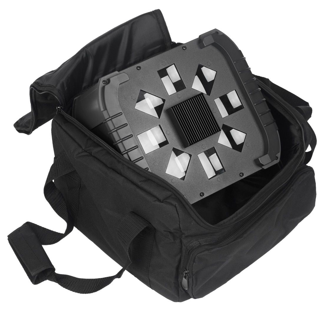 Prepravný obal Táto prepravná taška od spoločnosti ADJ bola navrhnutá na bezpečnú prepravu reflektorov a iného osvetľovacieho vybavenia. Je vyrobená z ľahkého, ale odolného syntetického materiálu, ktorý v kombinácii s mäkkým vnútorným polstrovaním zaisťuje bezpečnú prepravu zariadenia. Ideálna pre mobilných osvetľovačov, DJ-ov a iných cestujúcich umelcov. Rozmery tašky sú 310 x 320 x 190 mm.