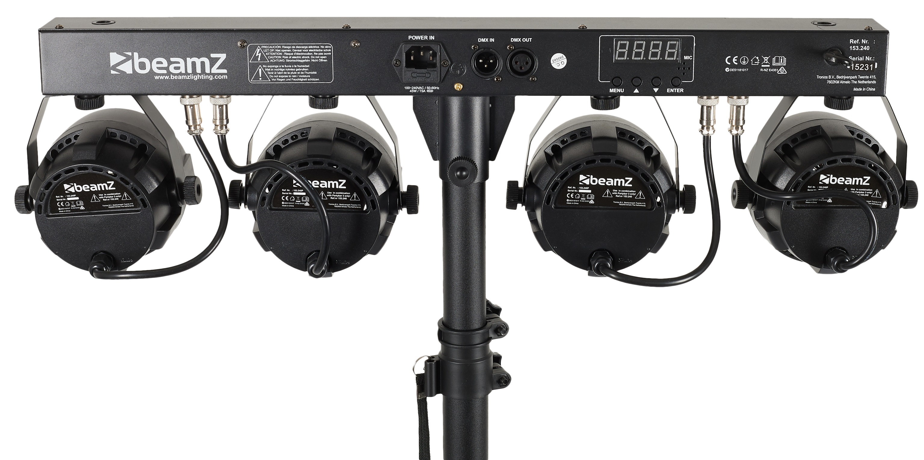 Svetelná zostava BeamZ PartyBar3 ponúka komplexné osvetlenie pre hudobné kluby, diskotéky, DJ-ov, domáce alebo vonkajšie párty a prezentácie. Svetelný bar sa skladá zo štyroch bodových svetlometov PAR, z ktorých každý je vybavený deviatimi 1W LED diódami rôznych farieb (3x červená, 3x zelená, 3x modrá) a centrálnou zabudovanou magickou guľou osvetlenou tromi farebnými LED diódami (1x červená, 1x zelená, 1x modrá). Súčasťou balenia je aj statív a IR diaľkové ovládanie na pohodlné ovládanie s