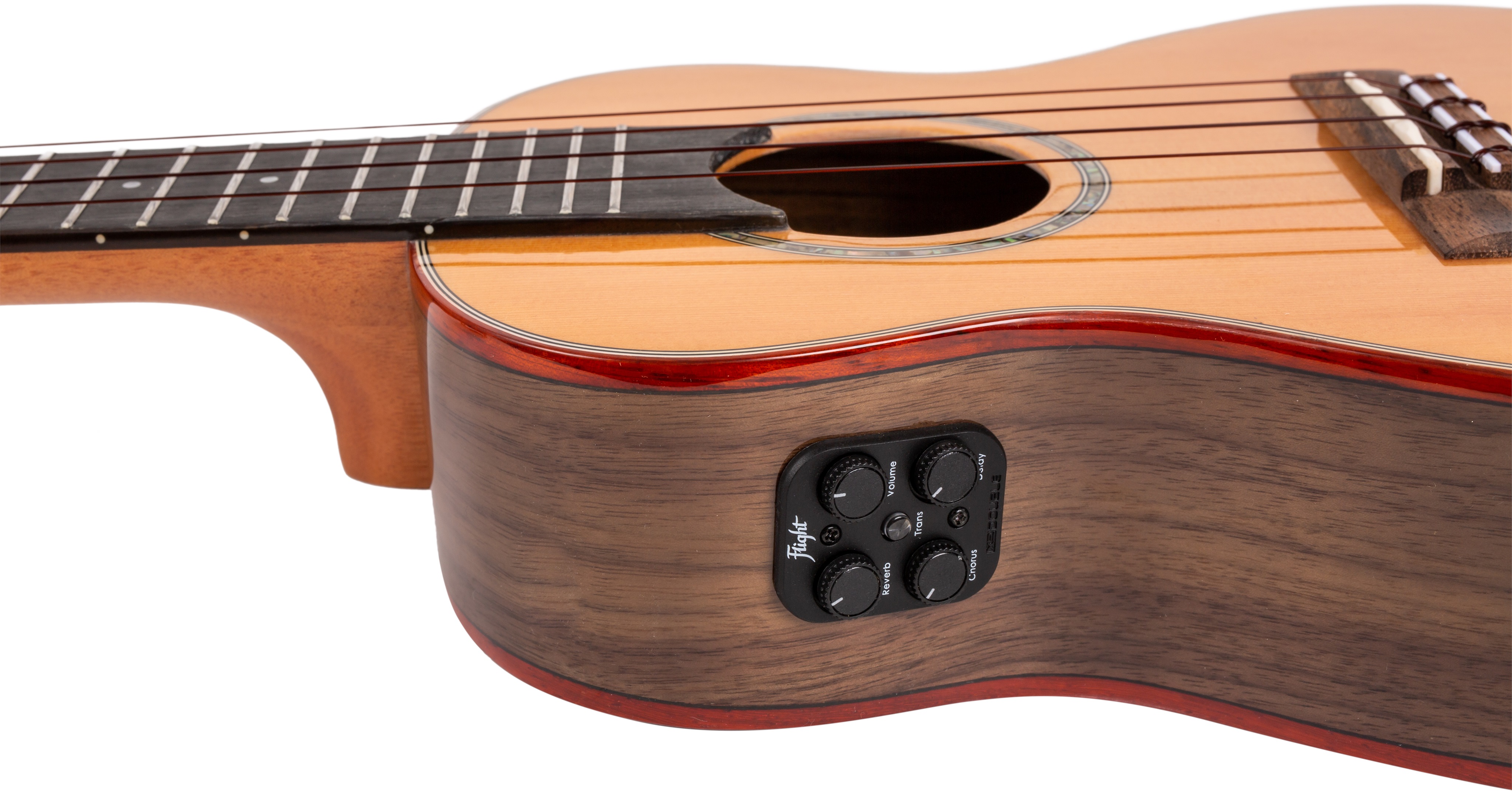 Elektroakustické ukulele Séria Princess od spoločnosti Flight obsahuje polomasívne akustické a elektroakustické modely ukulele s viacerými zaujímavými konštrukčnými prvkami. Modely Victoria, Sophia, Leia a ďalšie sa dodávajú v štýlovom červenom gig bagu s 15 mm polstrovaním. Predná strana koncertného ukulele Diana je vyrobená z masívneho cédra, zatiaľ čo zadná strana a luby sú vyrobené z laminovaného moreného orechového dreva, ktorého štruktúra pekne kontrastuje s cédrovou vrchnou doskou. Na krk z dreva pur