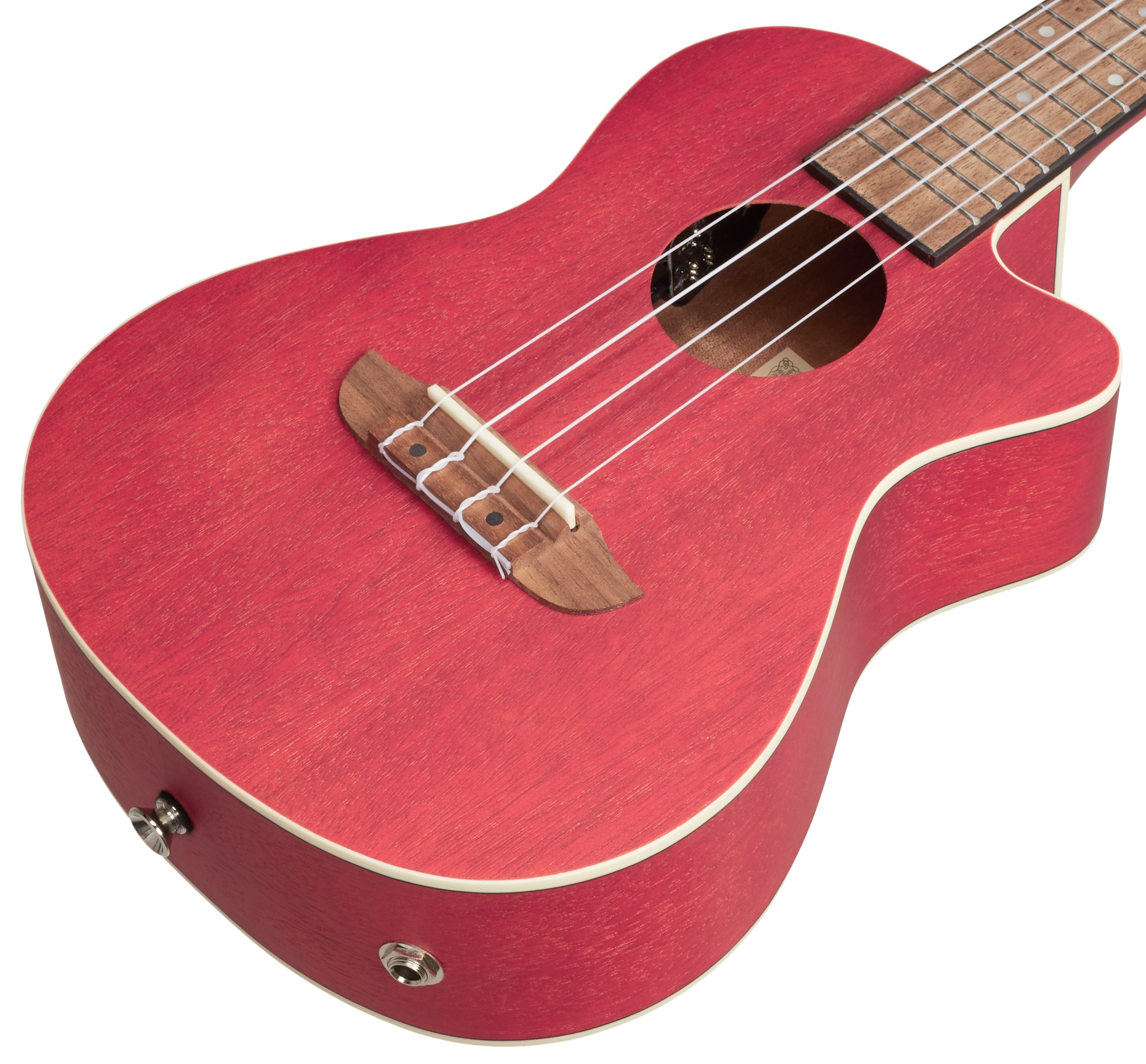 Elektroakustické ukulele Séria Earth od Ortegy prináša kvalitne spracované a cenovo dostupné ukulele vo farebnom prevedení vhodnom pre začiatočníkov aj pokročilých hráčov. Ide o nástroje koncertnej veľkosti, čo znamená, že sú o niečo väčšie ako soprány, ale stále si zachovávajú príjemné rozmery a typický zvuk, pre ktorý sú také obľúbené. Predná strana tohto ukulele je vyrobená z preglejky okoumé, zadná strana a boky zo sapele. Telo zdobí povrchová úprava Ruby Raspberry a biela obvodová lišta ABS. K mahagóno