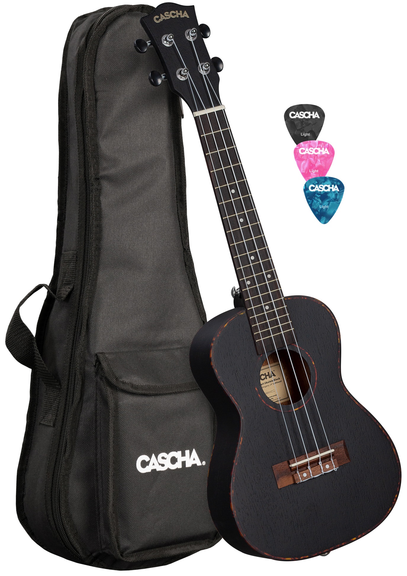 Ľavoručné akustické ukulele Akustické ukulele Cascha HH 2300L Concert Mahogany LH Black pre ľavákov zo série Mahogany je cenovo dostupný nástroj, ktorý poteší deti aj dospelých. Spolu s ukulele dostanete praktické polstrované puzdro a tri trsátka, takže sa môžete rovno pustiť do zábavy. Telo ukulele je vyrobené z laminovaného mahagónu. Palisandrový hmatník je rozdelený osemnástimi pražcami. Struny držia vo firemných ladiacich mechanikách gitarového štýlu a palisandrovom hmatníku. Štýlové spracovanie podčiar