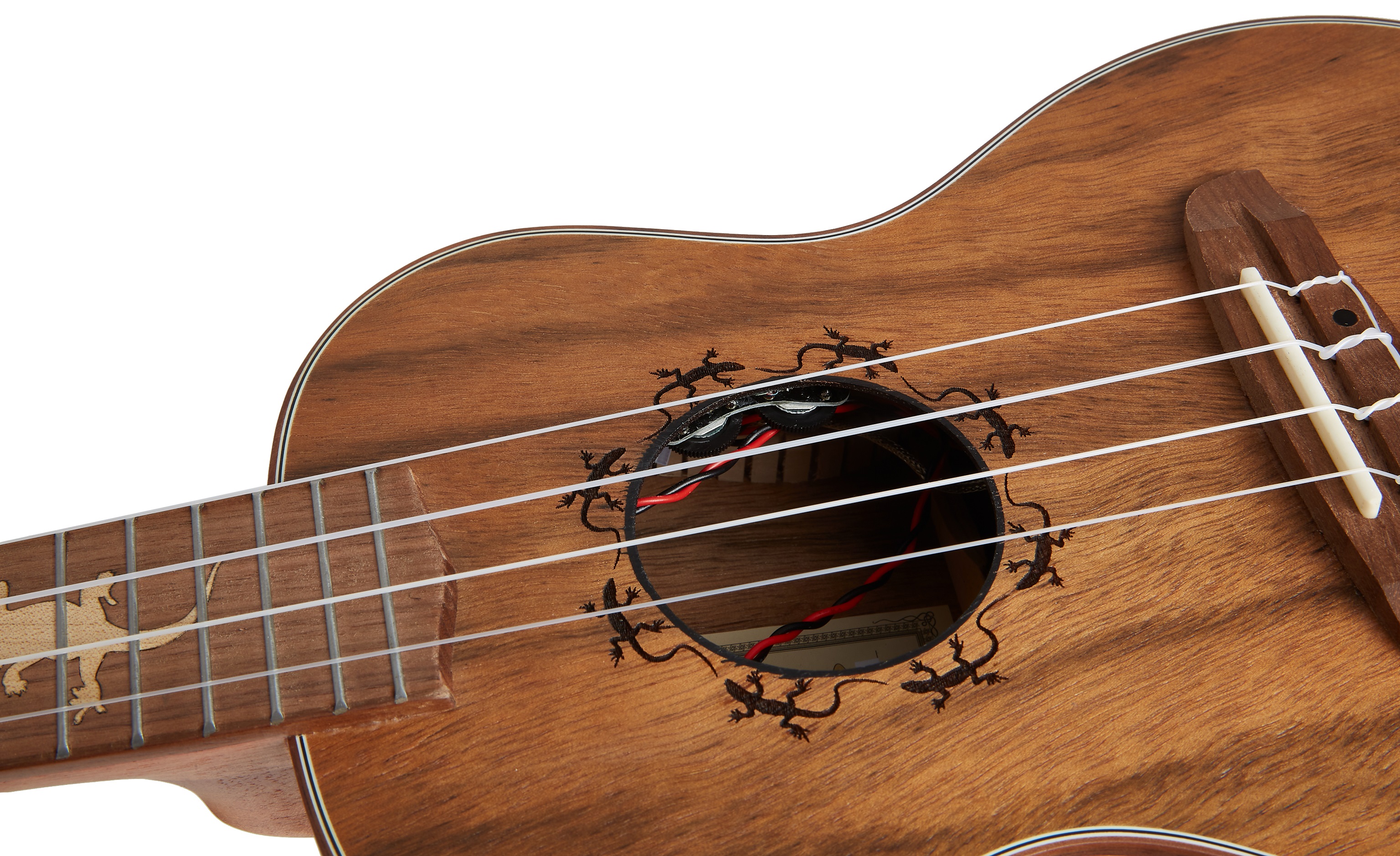 Ľavoručné elektroakustické ukulele Elektroakustické ukulele Lizard z rovnomennej série Ortega ponúka kvalitné spracovanie, skvelý vzhľad exotických drevín a štýlový dizajn v podobe laserového gravírovania s motívmi jašterice (hmatník, rozeta). Nástroje sa dodávajú v praktickom gig bagu. Telo tohto koncertného ukulele je vyrobené z prelisovaného exotického dreva dao. K mahagónovému krku je prilepený orechový hmatník so šestnástimi pražcami. Struny sú osadené v orechovom hmatníku a uzavretých ladiacich mechan