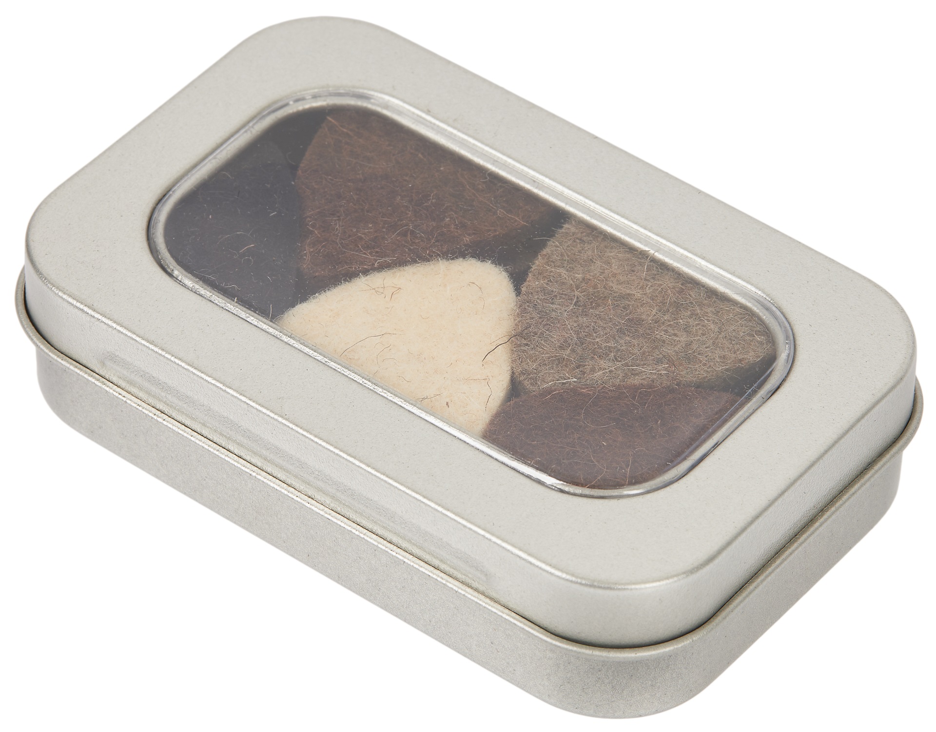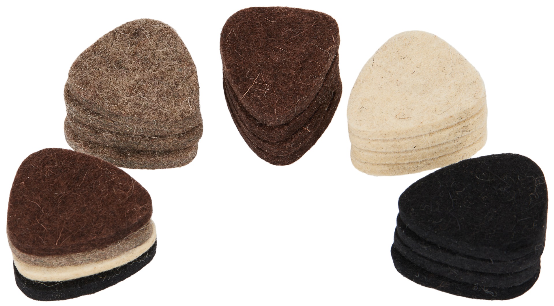 Brnkátka Sada dvadsiatich trsátok z vlnenej plsti, ktoré sú ideálne na hru na ukulele. Prírodná vlna je mäkká a poddajná, takže je jemná k nylonovým strunám a dodáva zvuku guľatý a teplý tón. V balení nájdete trsátka rôznej tvrdosti – biele majú hrúbku 4 mm, sivé 5 mm, hnedé a čierne 5 mm a sú navyše vystužené, čo zvyšuje ich tvrdosť a dodáva im jasnejší zvuk. Súčasťou balenia je praktická plechová krabička. Britská spoločnosť Timber Tones sa špecializuje na výrobu trsátok od roku 2009. Ned