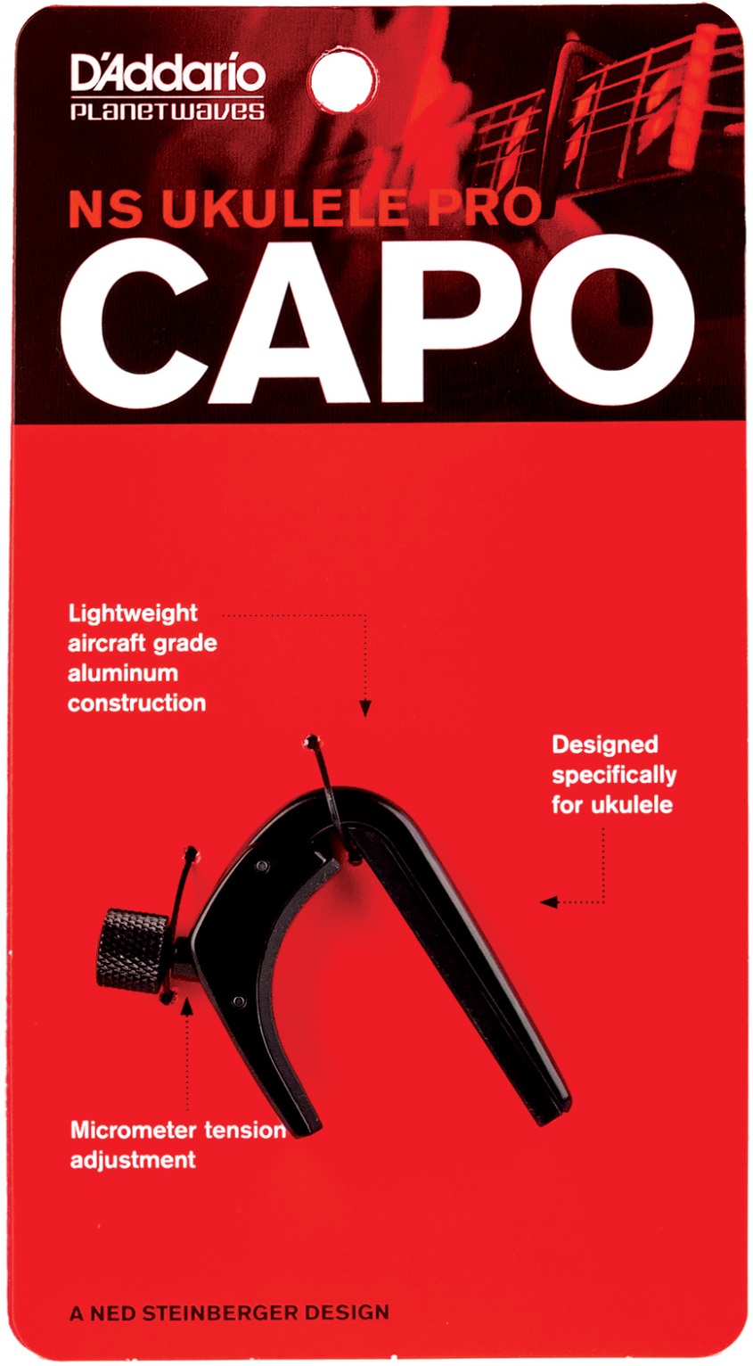 Kapodaster Kapodastr špeciálne navrhnutý pre ukulele. Je vyrobený z leteckého hliníka, ktorý je veľmi odolný a zároveň ultraľahký, takže nezvyšuje hmotnosť krku. Vďaka mikrometru je možné nastaviť presný tlak kapodastra, aby sa predišlo vytrhnutiu strún.