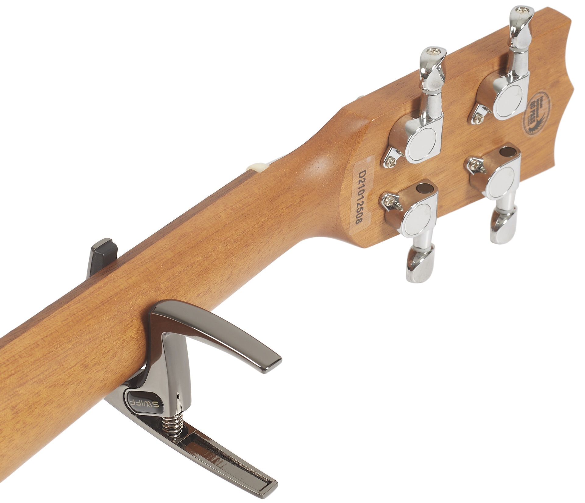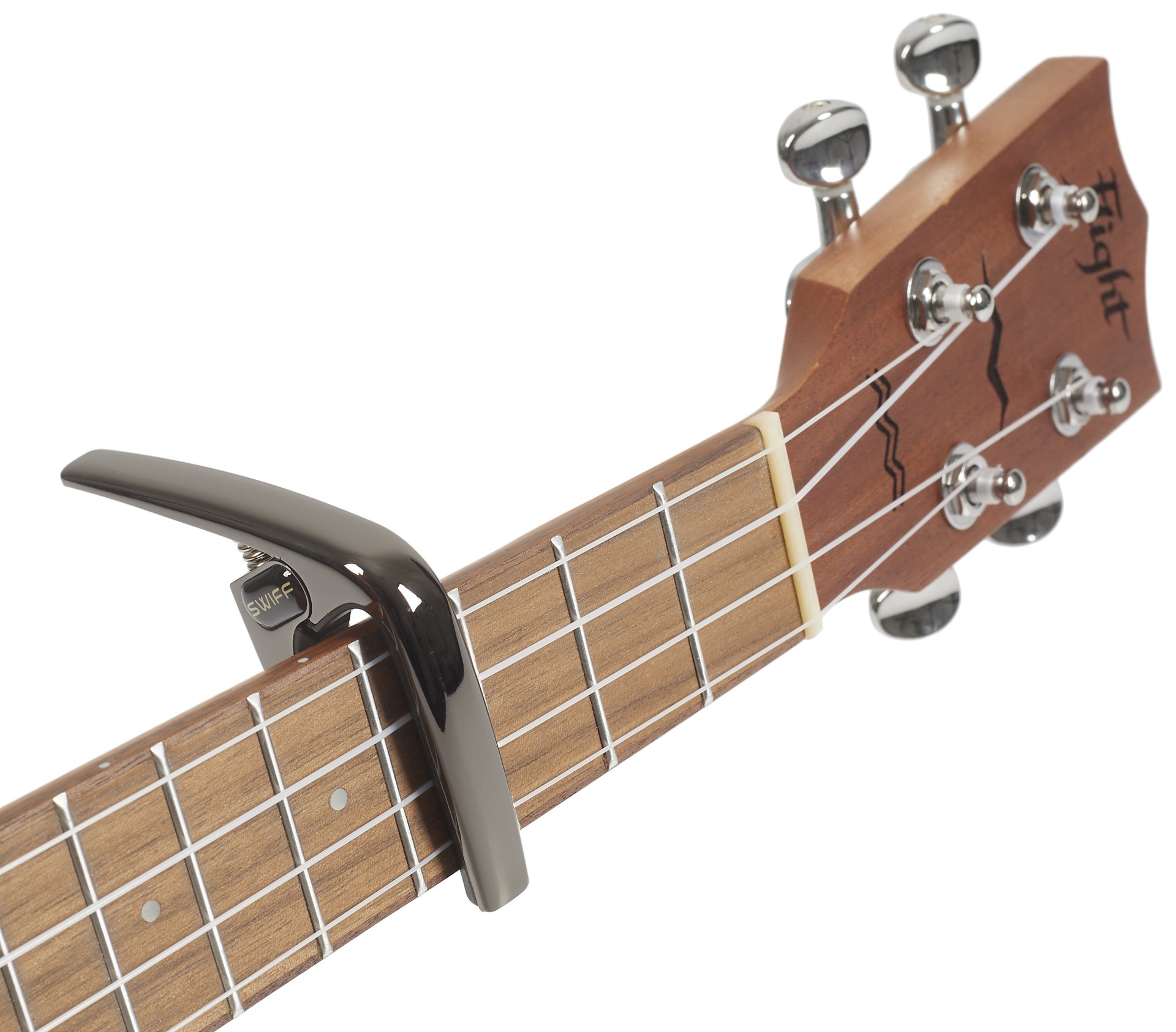 Kapodaster Swiff K8-C je kvalitný pružinový kapodastr vhodný pre ukulele. Je vyrobený zo zinkovej zliatiny a má elegantný dizajn. Vďaka kvalitnej pružine umožňuje rýchly a jednoduchý pohyb po hmatníku, takže ladenie budete môcť transponovať v priebehu niekoľkých sekúnd.