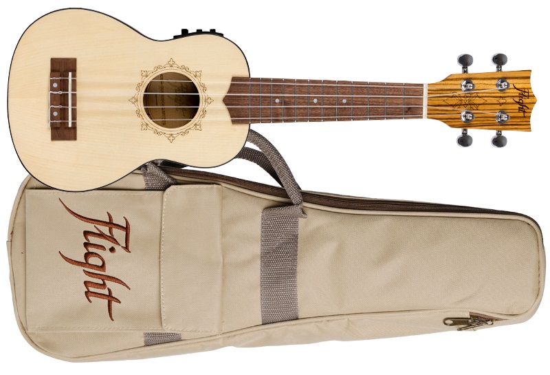 Elektroakustické ukulele Séria Flight's Designer ponúka cenovo dostupné modely ukulele s tradičnými prírodnými/ dizajnovými drevami, ktoré sú vhodné pre začínajúcich hráčov na ukulele a pre hráčov na ukulele. Telo tohto elektroakustického sopránového ukulele pozostáva z laminovanej smrekovej prednej dosky a laminovanej zadnej dosky a lubov z exotického dreva zebra. Krk a hmatník nástroja sú vyrobené z afrického okoumé a orechového dreva, čo je tiež pomerne často používaná kombinácia drevín. Struny sú ukotve