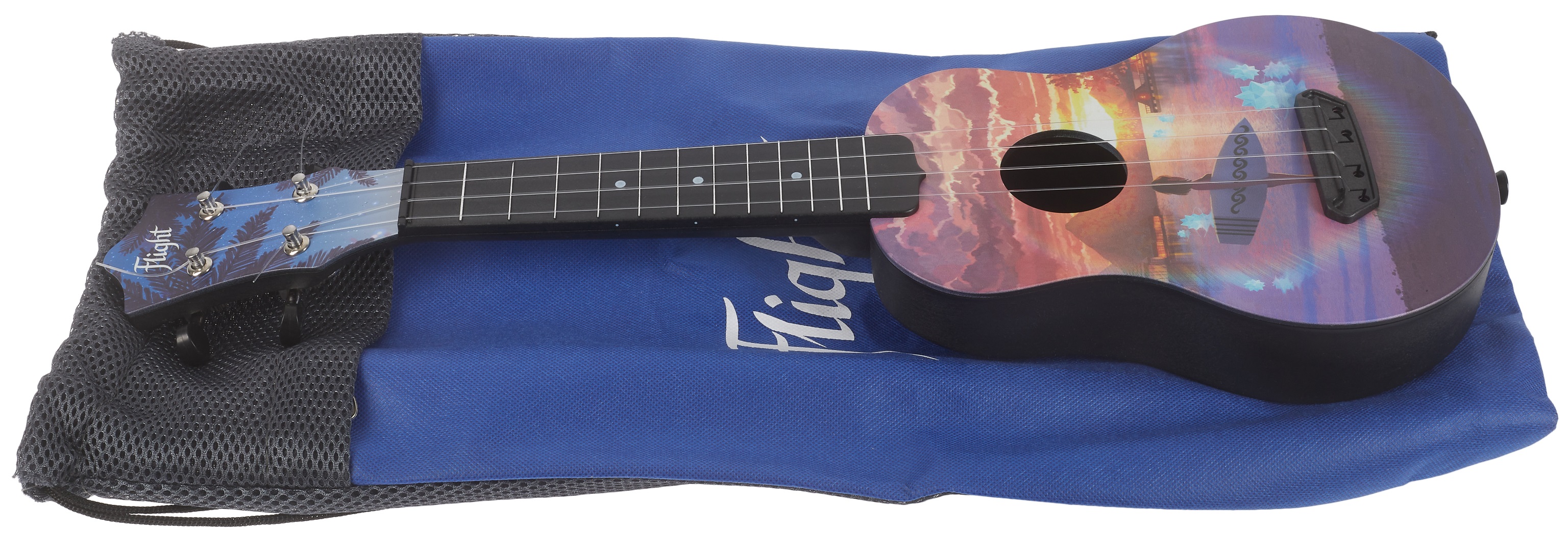 Akustické ukulele Séria Ultra Travel od spoločnosti Flight ponúka cenovo dostupné modely ukulele vyrobené zo zosilneného plastu (polykarbonátu), takže bez úhony prežijú vaše výkyvy nálad aj rozmary počasia. Telo z polykarbonátom vystuženého plastu spolu s modernou mriežkovanou výstuhou a fluorokarbónovými strunami dodávajú sopránovému ukulele UTS-42 čistý, úderný zvuk, ktorý je na plastové ukulele veľmi hlasný. Hmatník a krk sú vyrobené z rovnakého plastového materiálu ako telo. Struny sú ukotvené v ladiaci