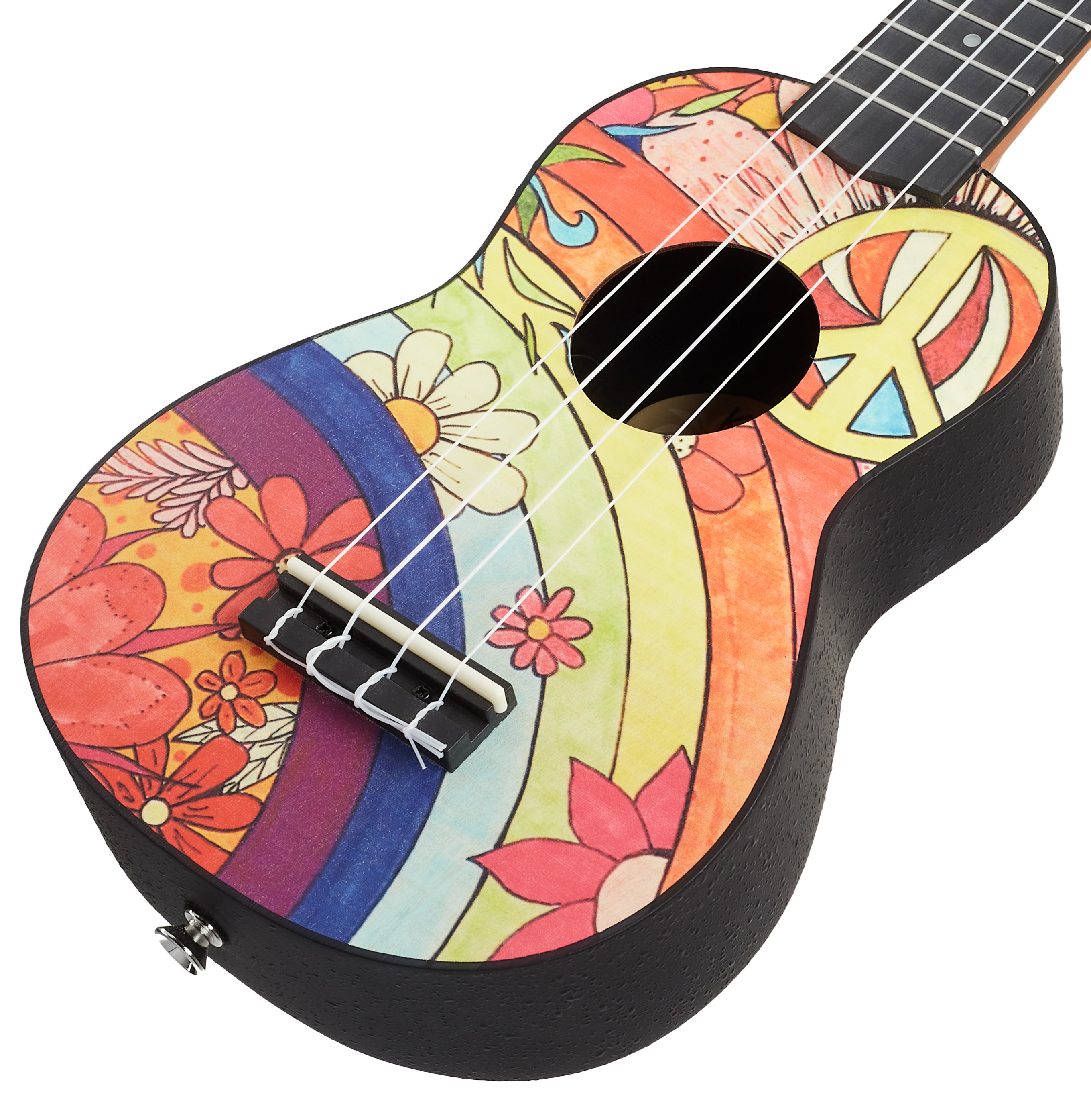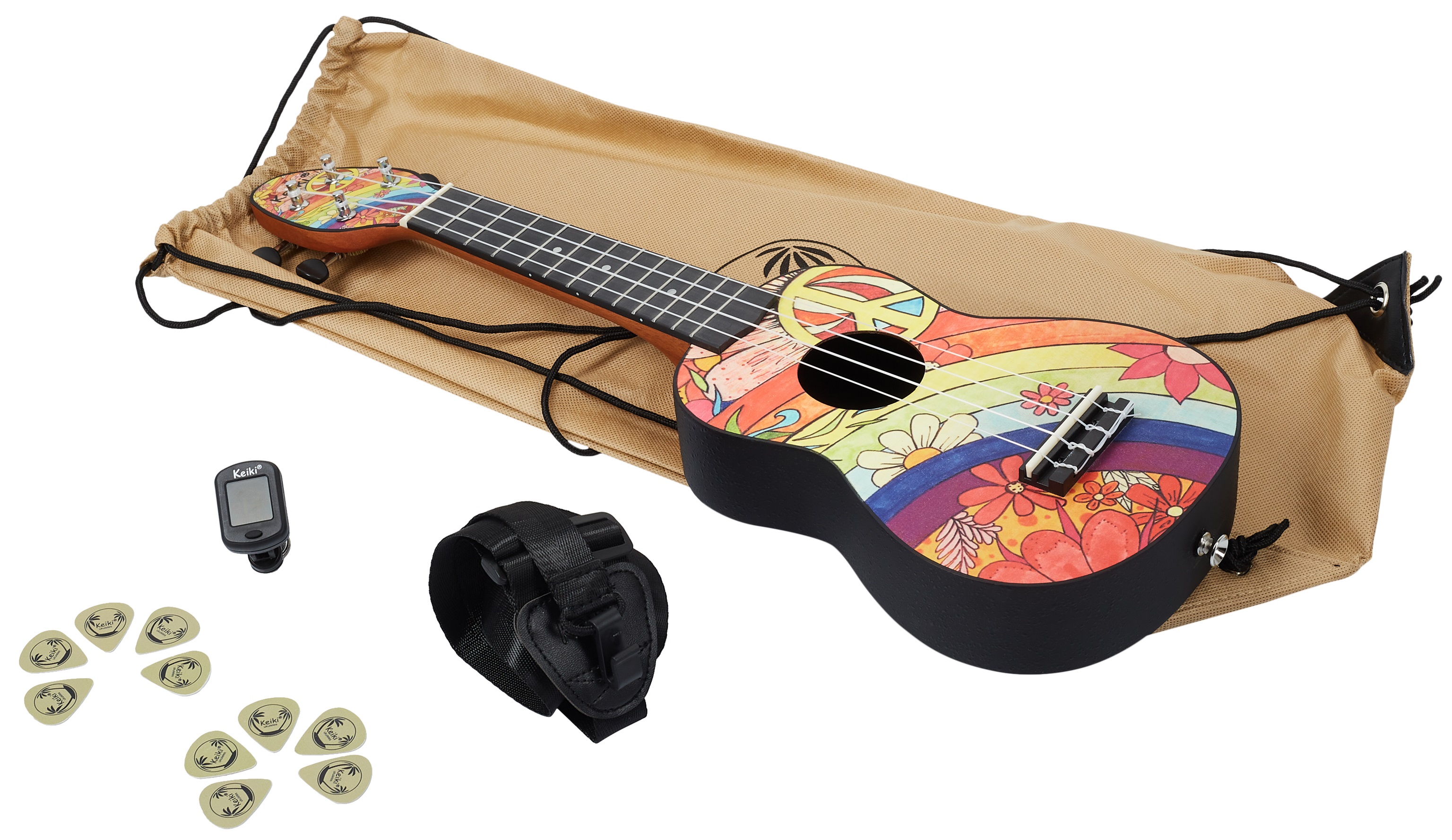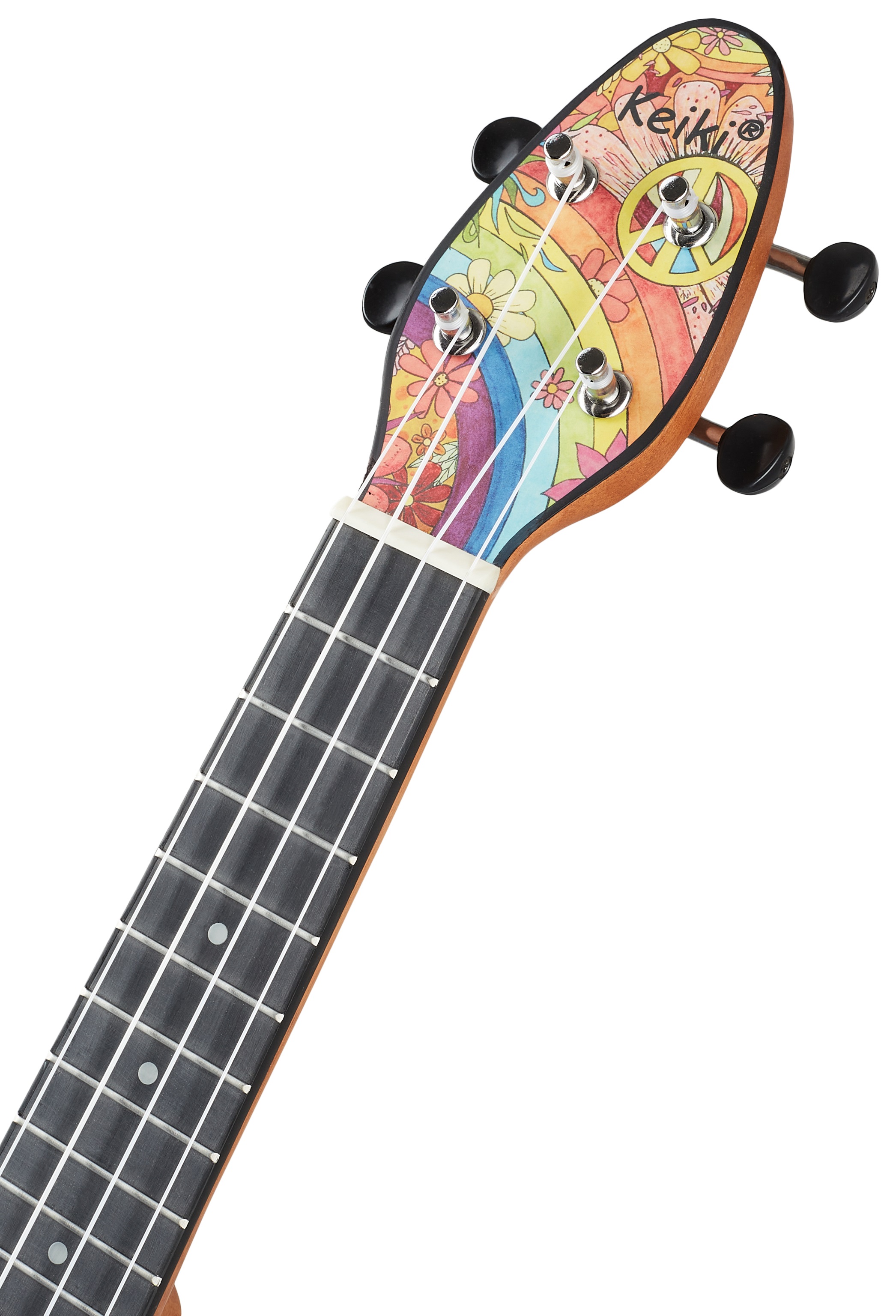 Akustické ukulele Rad Ortega Keiki je rozšírený o sopránové ukulele s farebnými grafickými motívmi inšpirovanými pouličným umením. Vaše deti si osvoja základné návyky a zručnosti potrebné na hru na gitaru alebo iné strunové nástroje. Konštrukcia ukulele pozostáva z laminovanej prednej dosky z agathisu a jemne klenutého tela z ABS plastu. Ku krku z okoumé je prilepený hmatník z ABS osadený dvanástimi pražcami. Struny sú uchytené v hmatníku z ABS a chrómovej otvorenej mechanike s čiernymi kolíkmi. Súčasťou ba