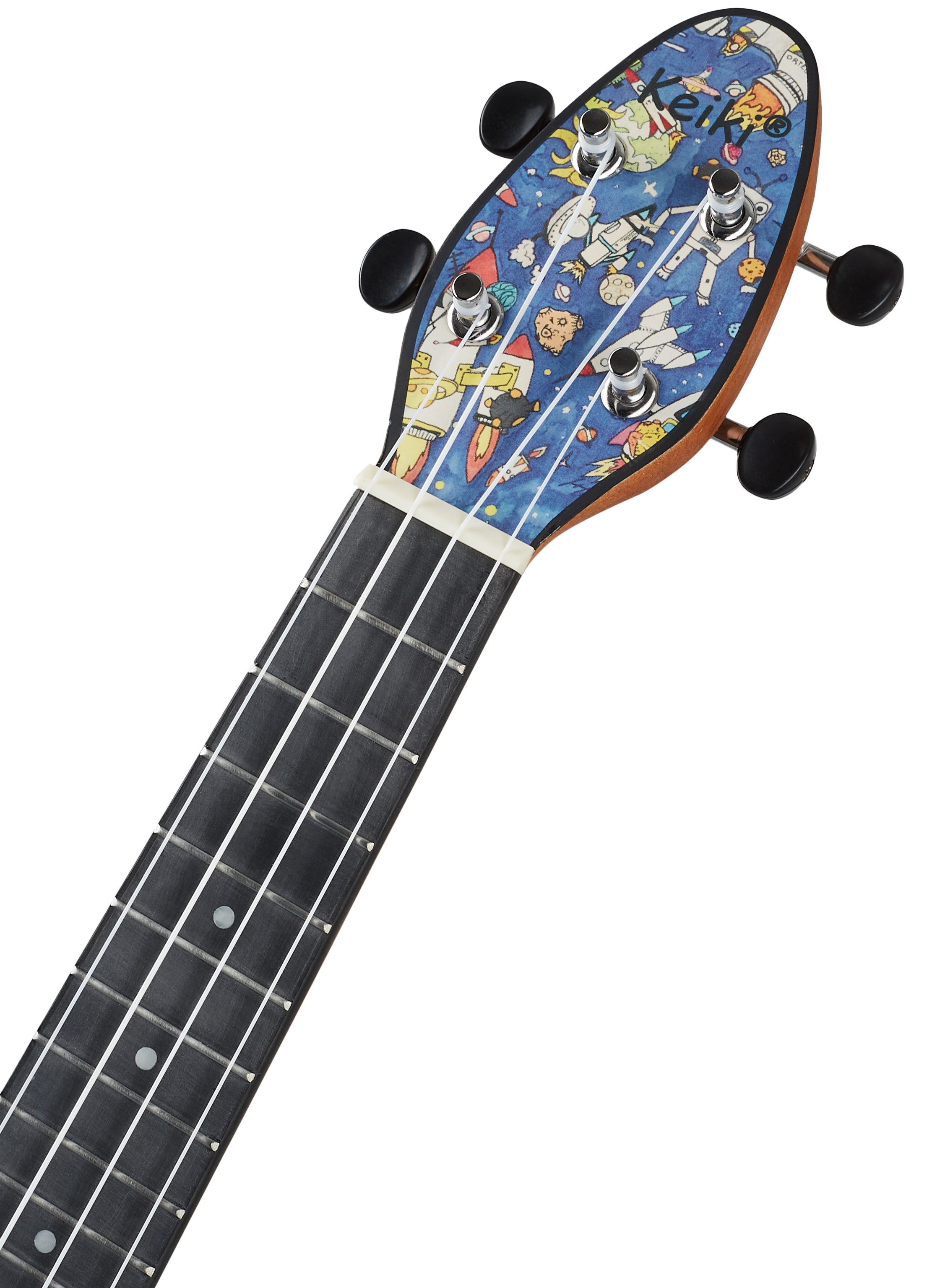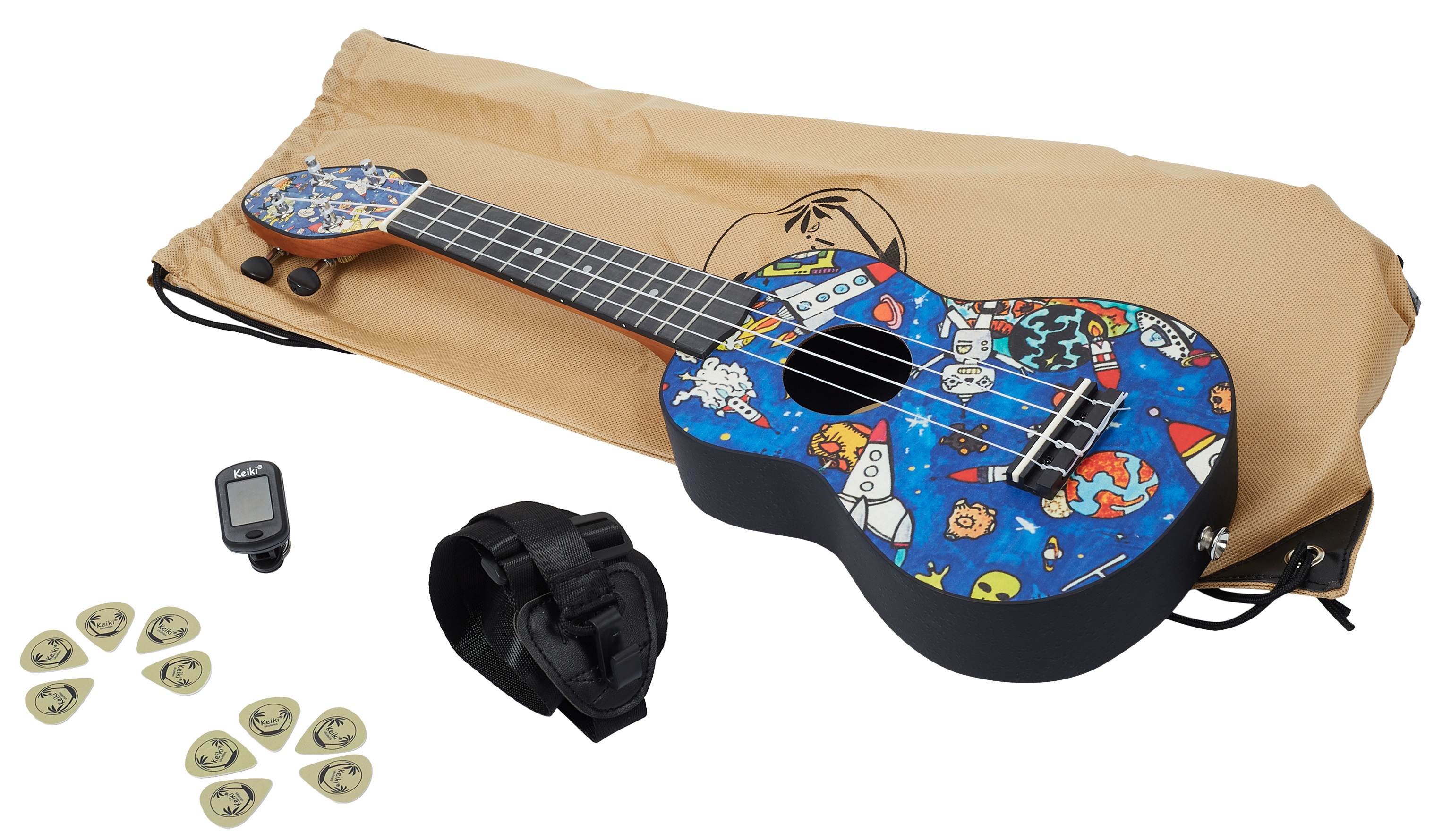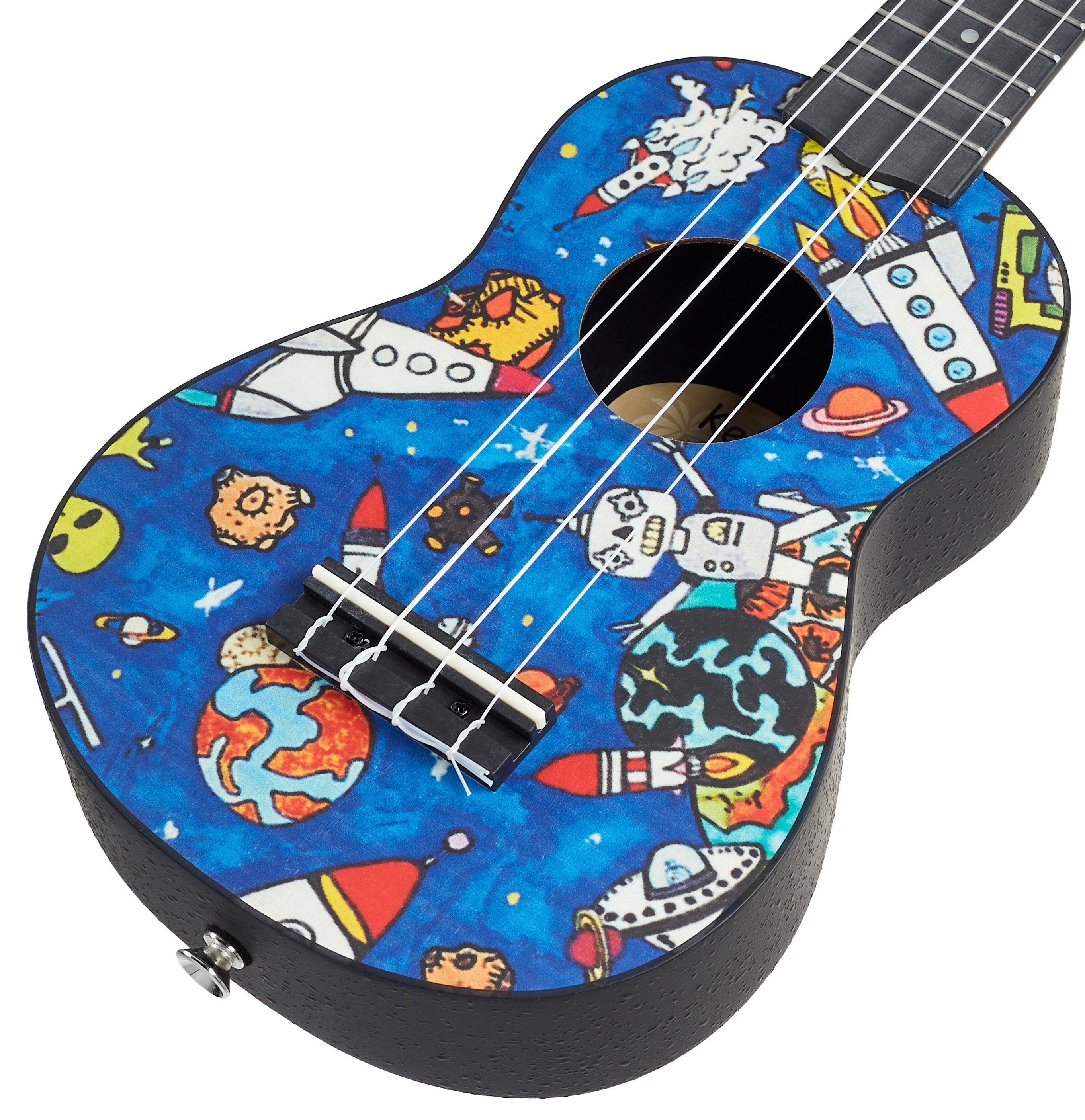 Akustické ukulele Rad Ortega Keiki je rozšírený o sopránové ukulele s farebnými grafickými motívmi inšpirovanými pouličným umením. Vaše deti si osvoja základné návyky a zručnosti potrebné na hru na gitaru alebo iné strunové nástroje. Konštrukcia ukulele pozostáva z laminovanej prednej dosky z agathisu a jemne klenutého tela z ABS plastu. Ku krku z okoumé je prilepený hmatník z ABS osadený dvanástimi pražcami. Struny sú uchytené v hmatníku z ABS a chrómovej otvorenej mechanike s čiernymi kolíkmi. Súčasťou ba
