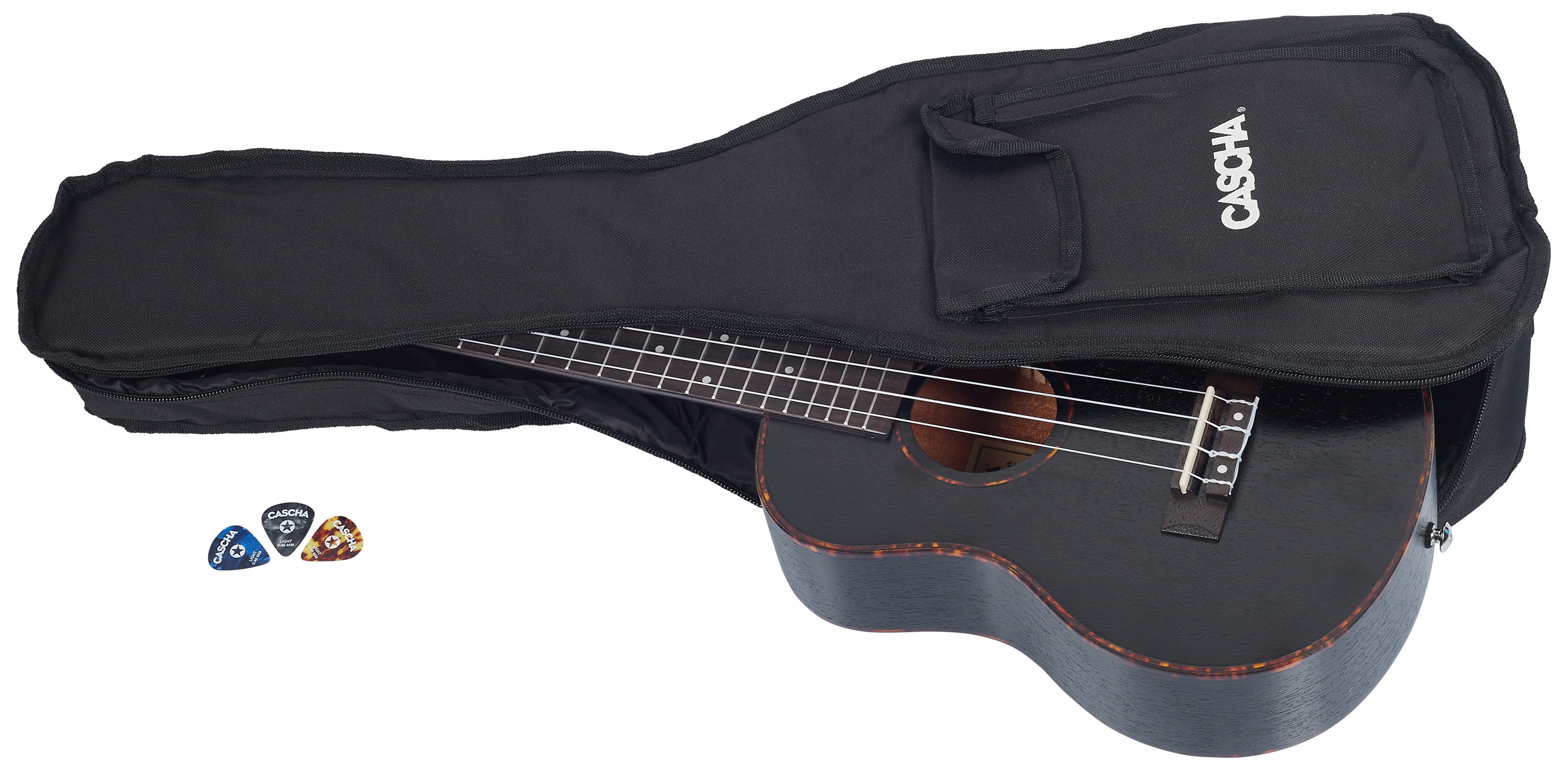 Akustické ukulele Tenor ukulele Cascha Premium je cenovo dostupný nástroj, ktorý poteší deti aj dospelých. Spolu s ukulele dostanete praktické polstrované puzdro (hrúbka polstrovania 5 mm) a tri trsátka, takže môžete okamžite vyraziť za zábavou k vode, na skaly, k moru… kdekoľvek to žije. Telo ukulele je vyrobené z mahagónu. Palisandrový hmatník je rozdelený devätnástimi pražcami (rovnaký materiál je použitý aj na hmatník). Struny sú uložené v pochrómovaných ladiacich mechanikách gitarového typu. Pekné sp