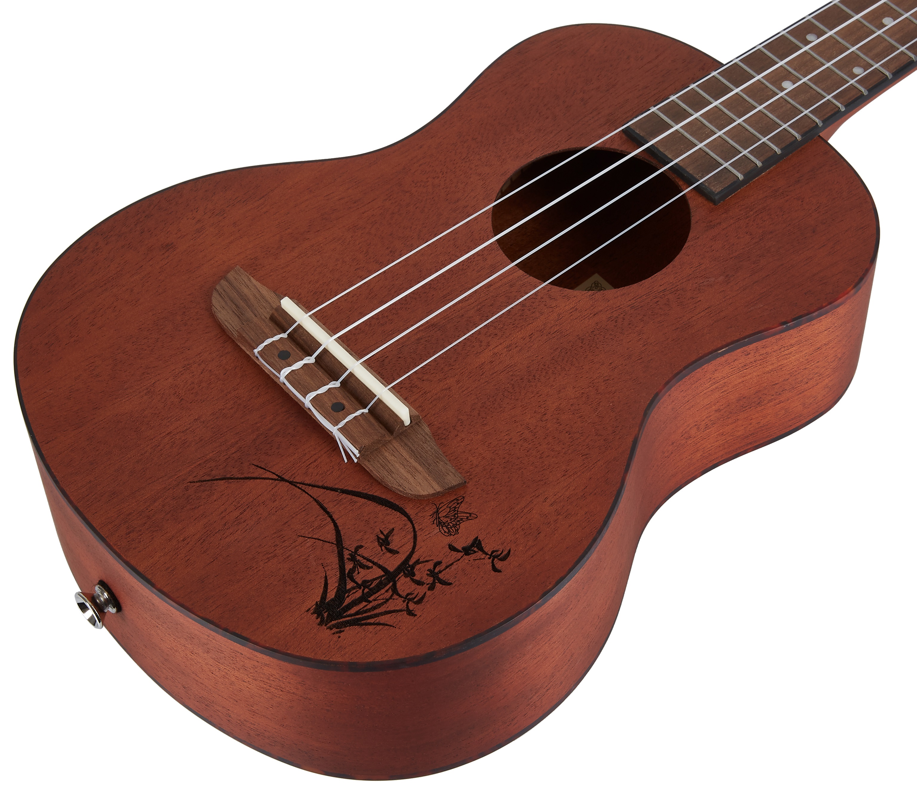 Akustické ukulele Ukulele Ortega zo série Bonfire sú ideálnou voľbou pre začiatočníkov na tento obľúbený nástroj. Ich spoločným menovateľom je kvalitné spracovanie a použitie časom overených materiálov (drevín). Telo tenorového ukulele RU5MM-TE je vyrobené z preglejky sapele. Predná doska je zdobená laserovým gravírovaním, telo obopína pás z materiálu ABS. Mahagónový krk je osadený orechovým hmatníkom s osemnástimi pražcami a polohovacie bodky uľahčujú orientáciu. Struny sú osadené v orechovom hmatníku a uz