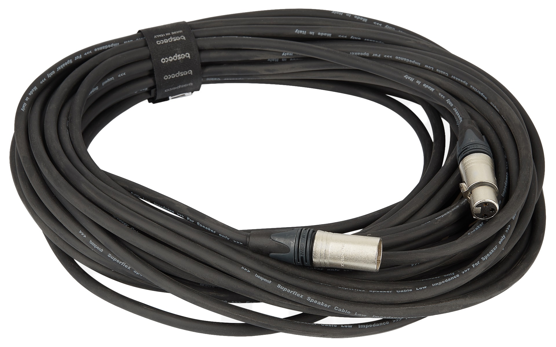 Reproduktorový kábel Tento dvojpólový reproduktorový kábel s konektormi XLR zo série Bespeco Professional je vhodný na pripojenie zosilňovača k pasívnemu reproduktorovému kabinetu. Má vodič z 99 % bezkyslíkatej medi (OFC) a vnútorný polovodivý PVC plášť, ktorý nevytvára šum. Ku kvalite zvuku prispieva aj špirálové tienenie na viac ako 94 % vodiča alebo špičkové konektory Neutrik. Samozrejmosťou je aj odolný a zároveň pružný plášť z PVC a vulkanizovaného silikónu. PO