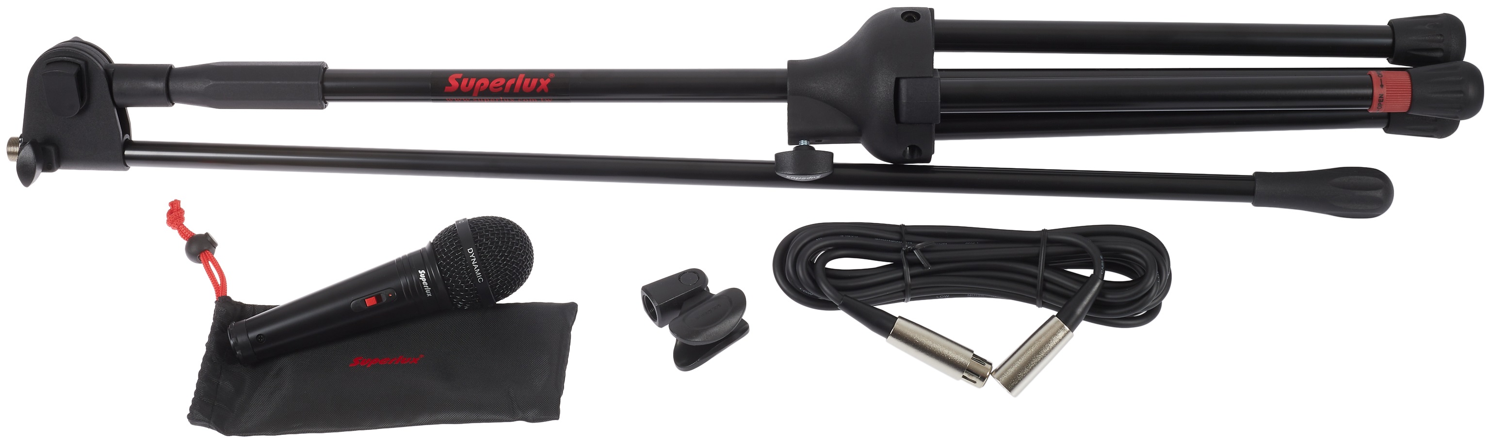 Dynamická mikrofónna súprava MSKA od spoločnosti Superlux je kompletná vokálna súprava. V balení nájdete mikrofón ECO-A, vysokokvalitný mikrofónový stojan MS108E, mikrofónovú svorku, 6 m kábel XLR, puzdro na mikrofón a obal na celé toto vybavenie.