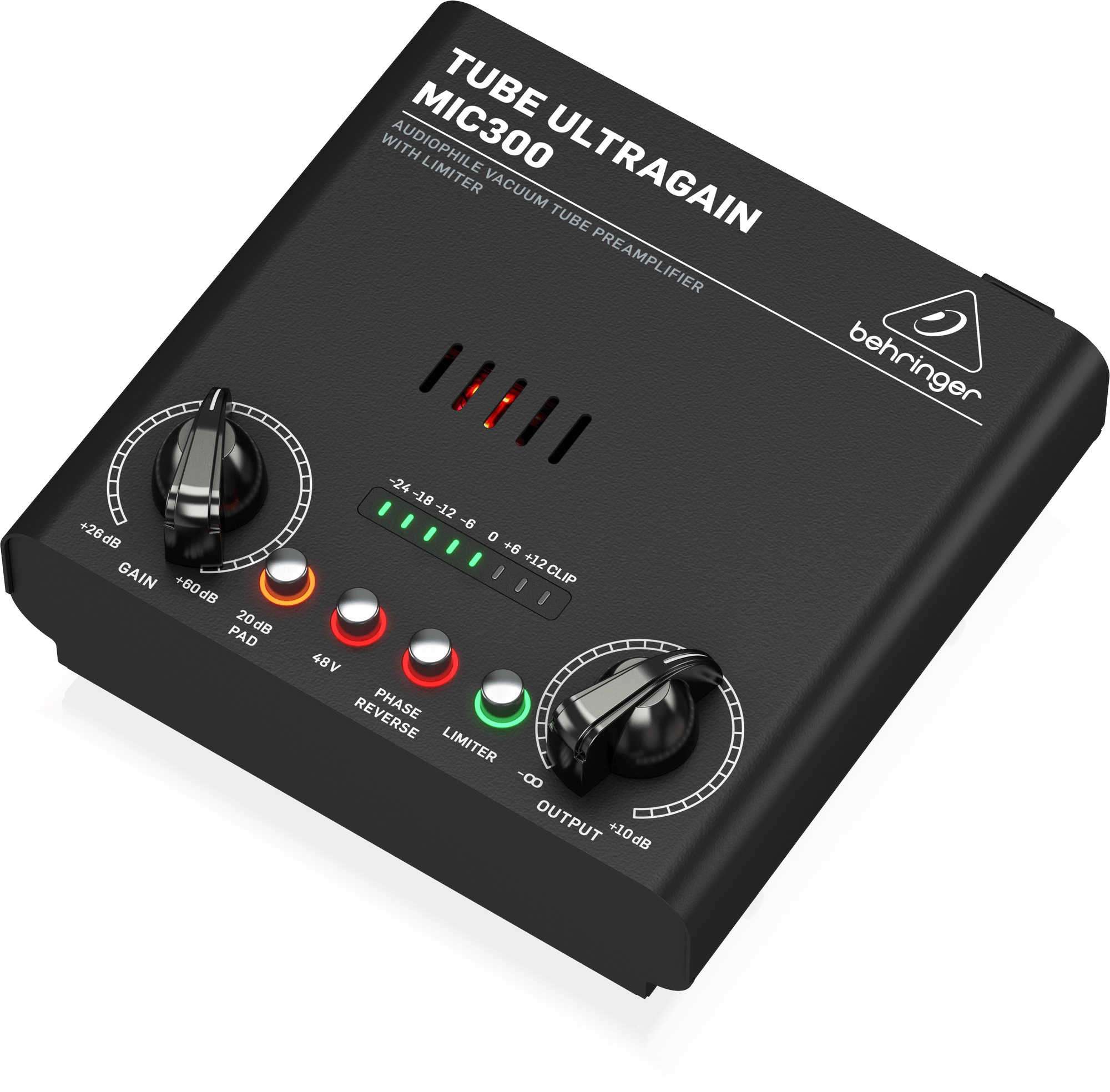 Mikrofónny predzosilňovač Behringer MIC300 je lampový jednokanálový predzosilňovač s limitérom. Lampy dokážu obohatiť signál o harmonické frekvencie, čím mu dodajú hĺbku a charakter. Hoci túto technológiu nahradili tranzistory, mnohí hudobníci sa zhodujú, že elektrónky poskytujú oveľa lepší zvuk. Ručne vybraná lampa 12AX7 v predzosilňovači TUBE ULTRAGAIN MIC300 dodáva všetkým zdrojom, od mikrofónov až po akustické alebo basové gitary, vintage lampový charakter. Predzosilňov