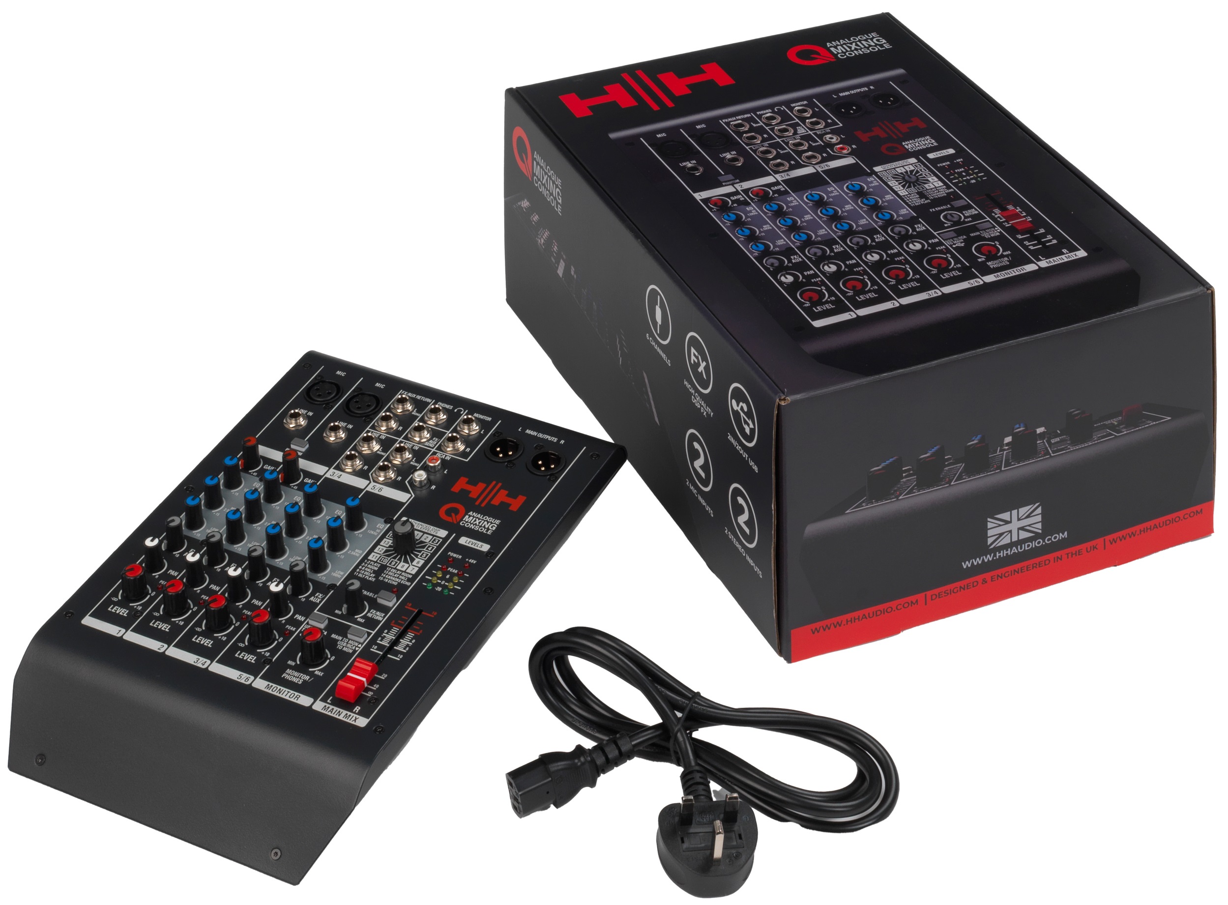 Analógový mixážny pult Analógový mixážny pult H&H Q6FX je kompaktné šesťkanálové zariadenie, ktoré možno použiť na základné ozvučenie v baroch, kluboch, na konferenciách a prednáškach alebo na nahrávanie hudby, podcastov a hlasových záznamov. Mixážny pult je vybavený dvoma mono kanálmi (1 a 2) s možnosťou výberu mikrofónových a linkových vstupov, pričom mikrofónové vstupy sú vybavené predzosilňovačmi s nízkym šumom, ovládačom Gain na plynulé nastavenie úrovne vstupnej citlivosti a fantó