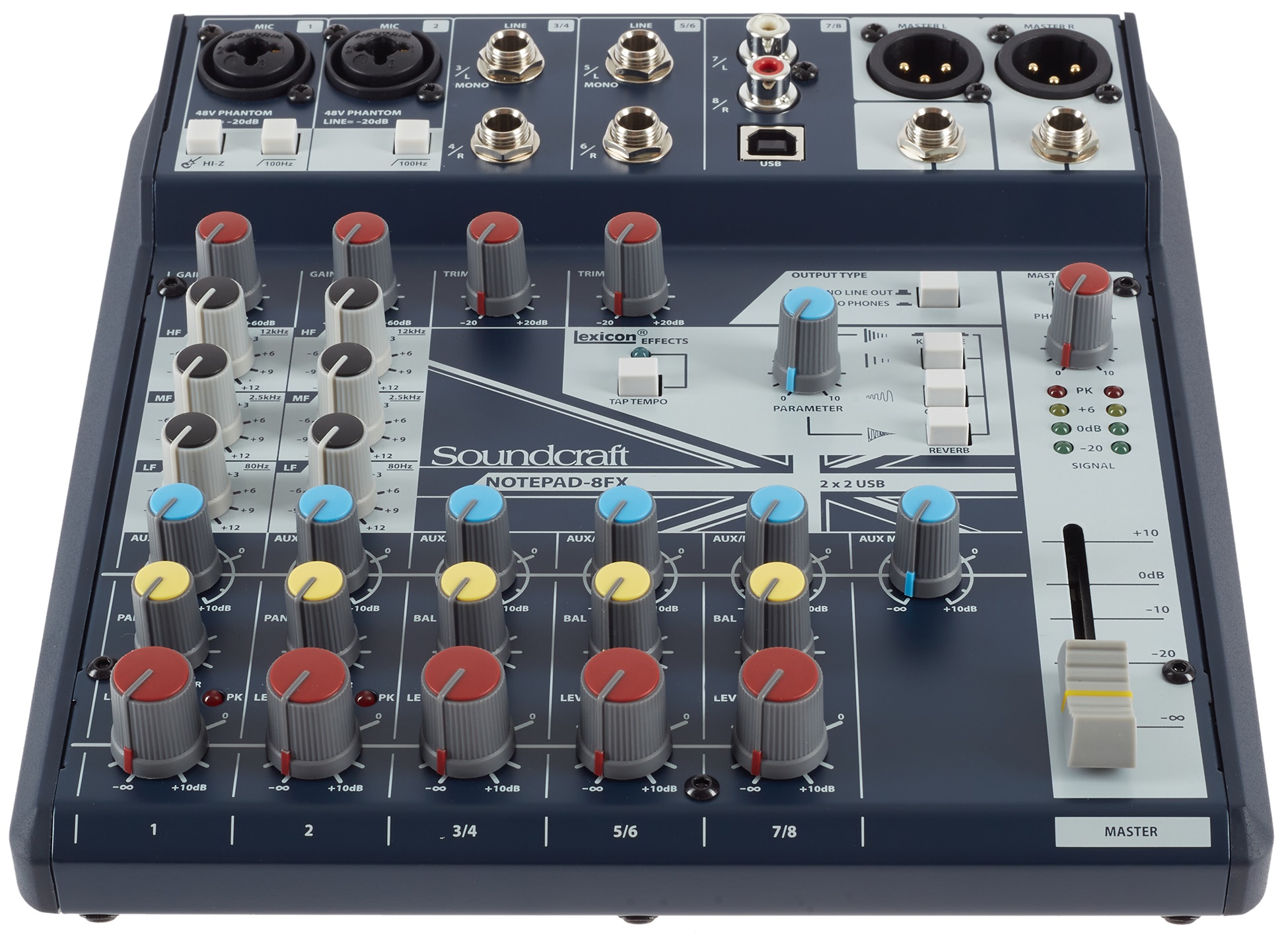 Analógový mixážny pult Mixážne pulty série Notepad ponúkajú kvalitný zvuk Soundcraft v kompaktnom balení. Mix Notepad 8FX kombinuje profesionálne analógové komponenty, spoľahlivé spracovanie signálu poháňané spoločnosťou HARMAN a zvukové rozhranie USB na pripojenie k vášmu obľúbenému editačnému softvéru na počítači PC alebo Mac. Výstupný signál môžete ďalej ozvláštniť ikonickými priestorovými efektmi Lexicon – reverb, echo, delay s tap tempom. Mikrofónové vstupy s kombo konektormi (Jack 6.3/XLR) sú okrem tr