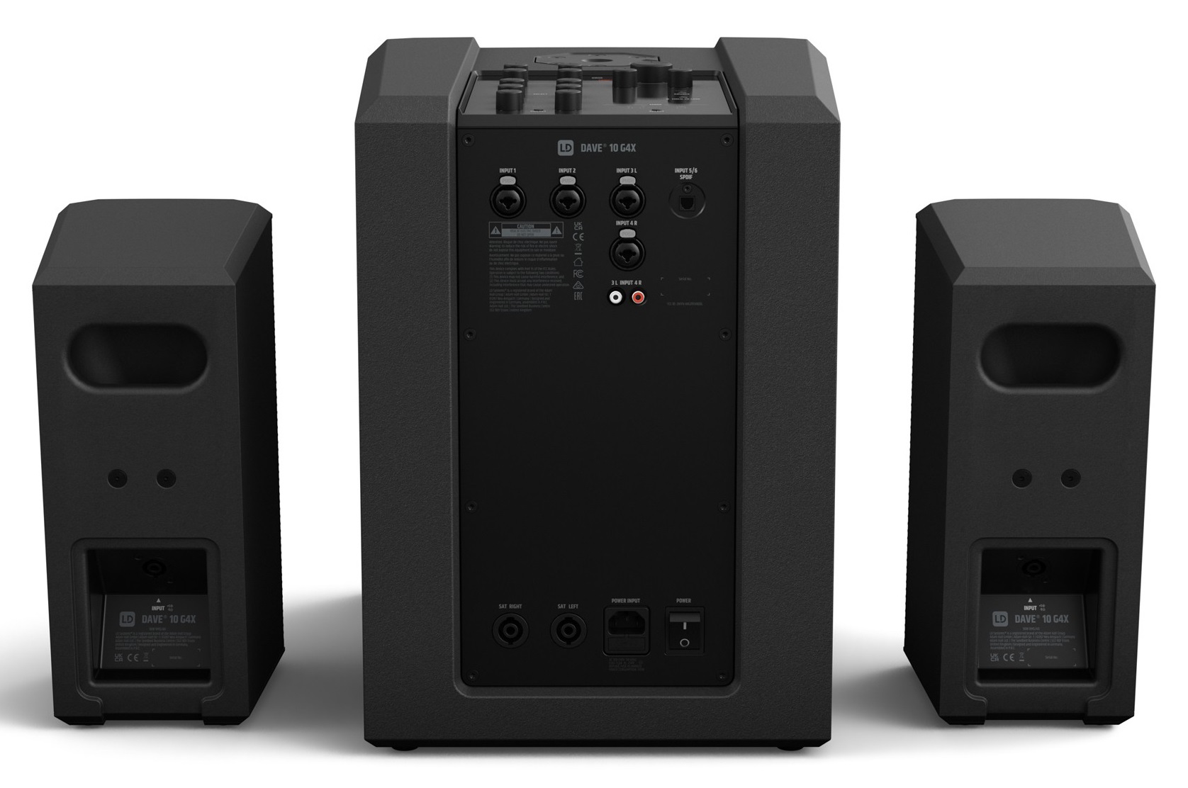 Ozvučovací systém Aktívny systém DAVE G4 2.1 poskytuje dostatočný výkon a kvalitu zvuku na živé vystúpenia, multimediálne prezentácie alebo trvalé klubové inštalácie. Systém sa skladá z dvoch stredotónových reproduktorov a jedného subwoofera. Satelity aj subwoofery sú vybavené hniezdami na vertikálnu inštaláciu pomocou voliteľných reproduktorových tyčí. Zvukový systém je vybavený šesťkanálovým mixom so samostatným dvojpásmovým ekvalizérom a efektom reverb. Prvé dva kanály sú ideálne na pripojenie mikrofónov