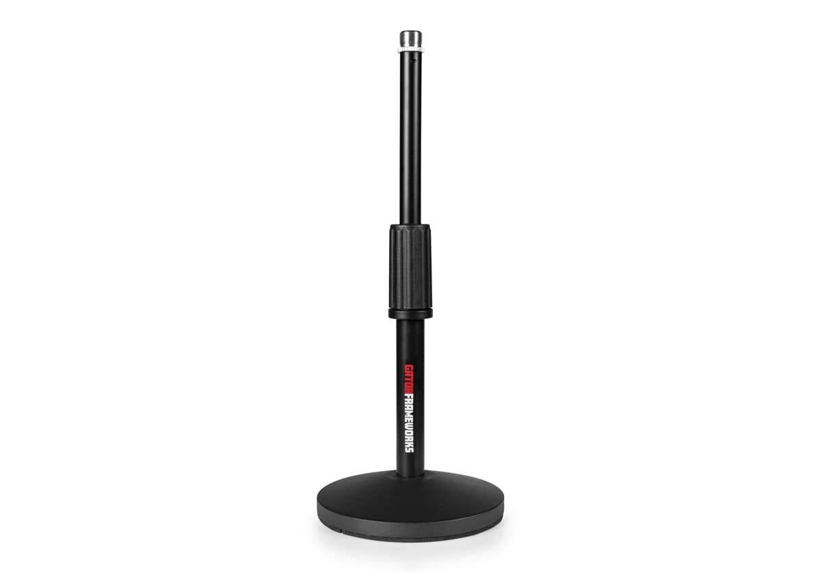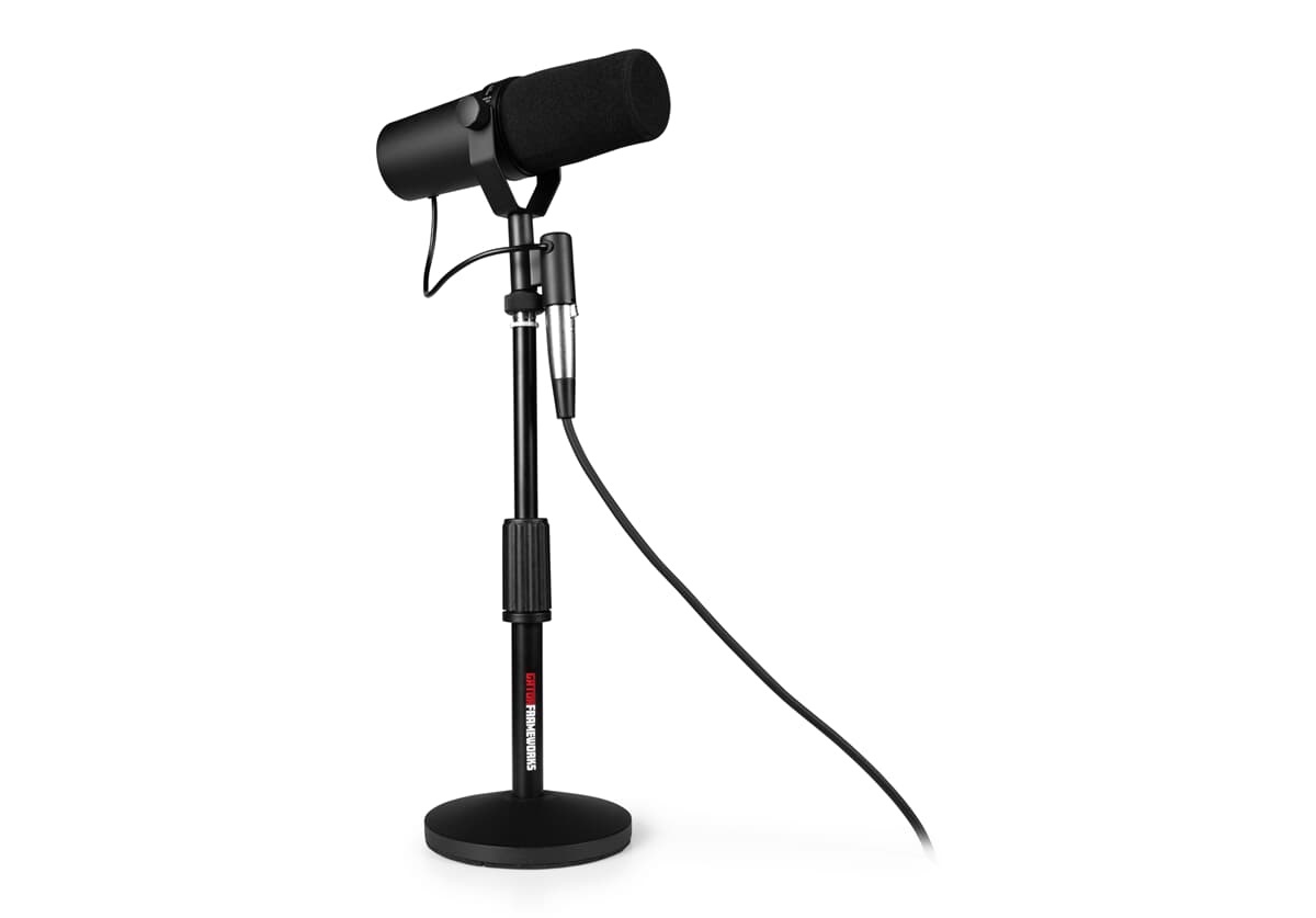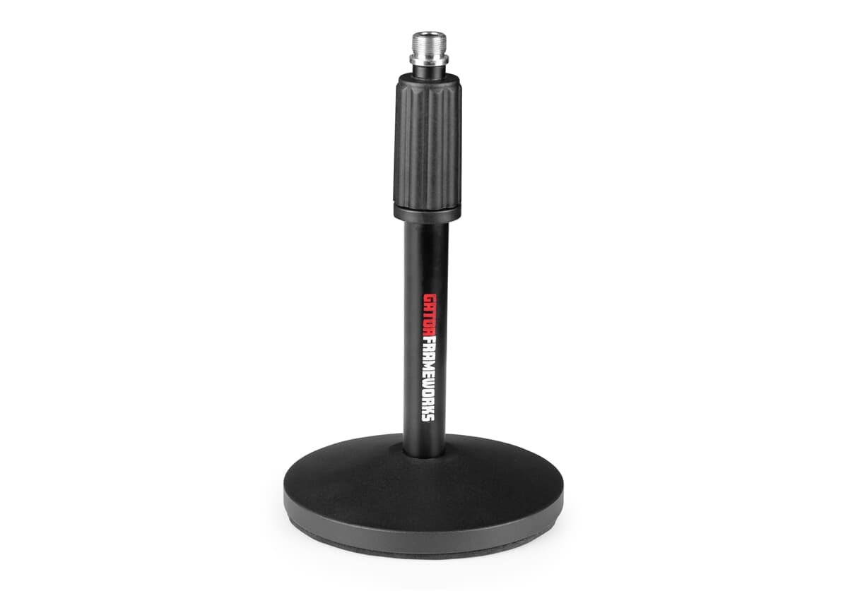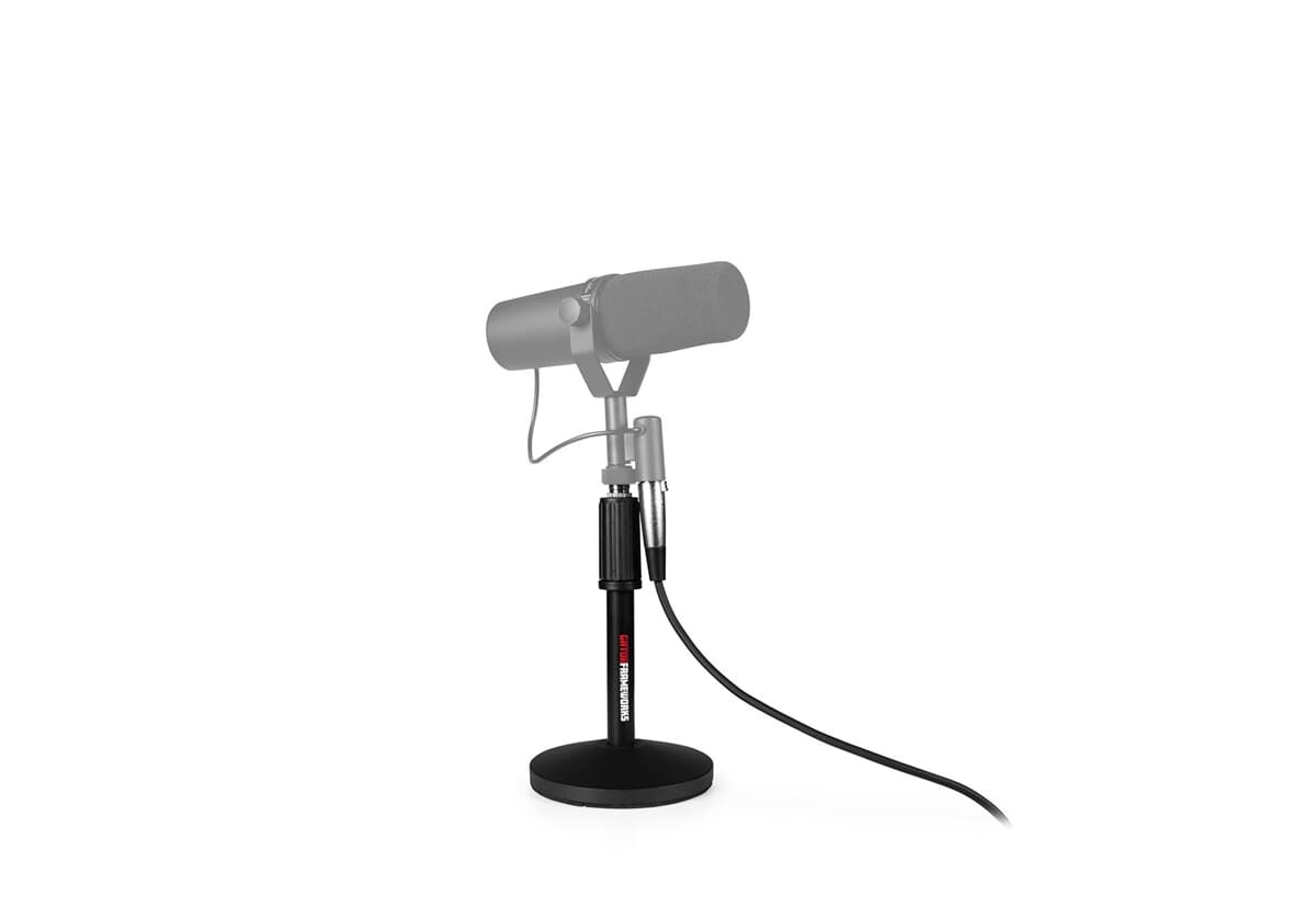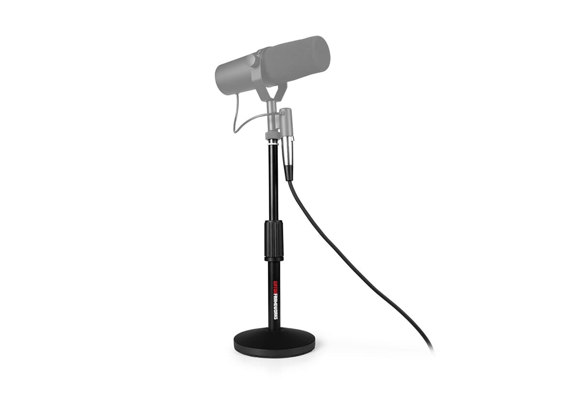 Mikrofónny stojan Súprava GFW-MIC-DESKTOP-2PK obsahuje dva oceľové stolové mikrofónové stojany s nastaviteľnou výškou a stabilnou základňou a dva približne trojmetrové (výrobca uvádza 10 palcov) káble XLR samec-samec. Stojany sú kompatibilné s akýmikoľvek mikrofónovými držiakmi so závitom 3/8 alebo 5/8 palca.