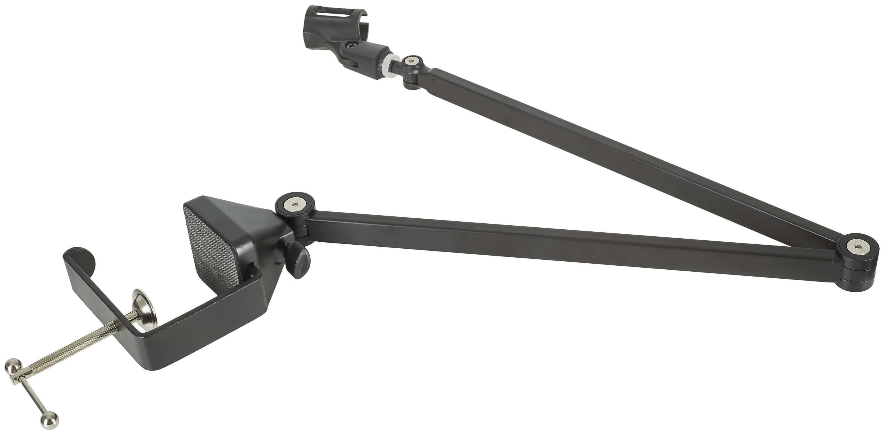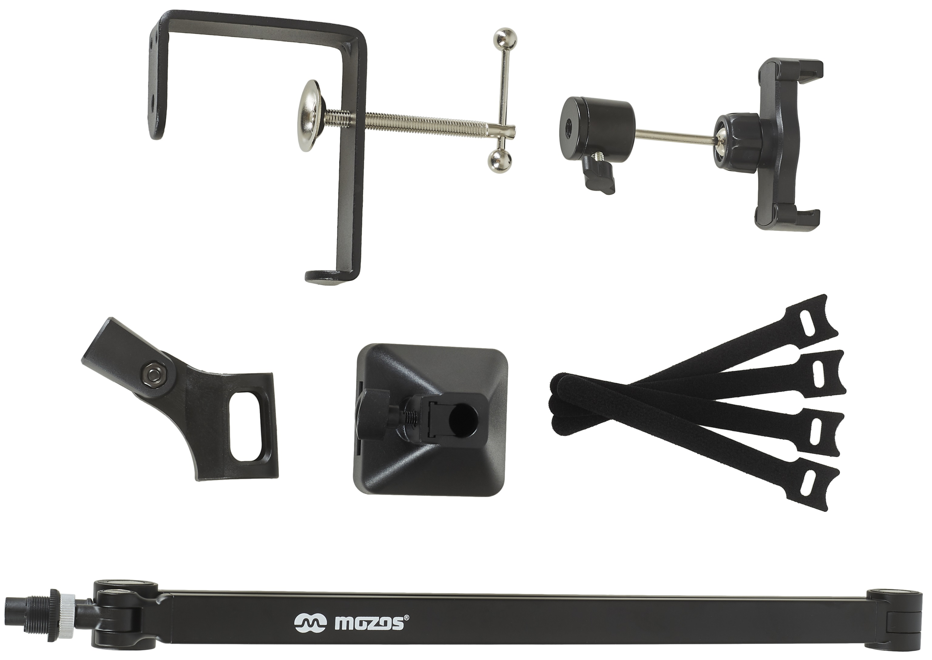 Mikrofónny stojan Stolný mikrofónový stojan Mozos SB42 s kovovou konštrukciou ponúka nosnosť až 2 kg, t. j. možnosť pracovať s profesionálnymi mikrofónmi, upevnenie na dosku stola so šírkou až 7 cm, flexibilitu ramena s dĺžkou 40 + 40 cm a širokú sadu príslušenstva (štyri popruhy na suchý zips, držiak na mikrofón, držiak na telefón).
