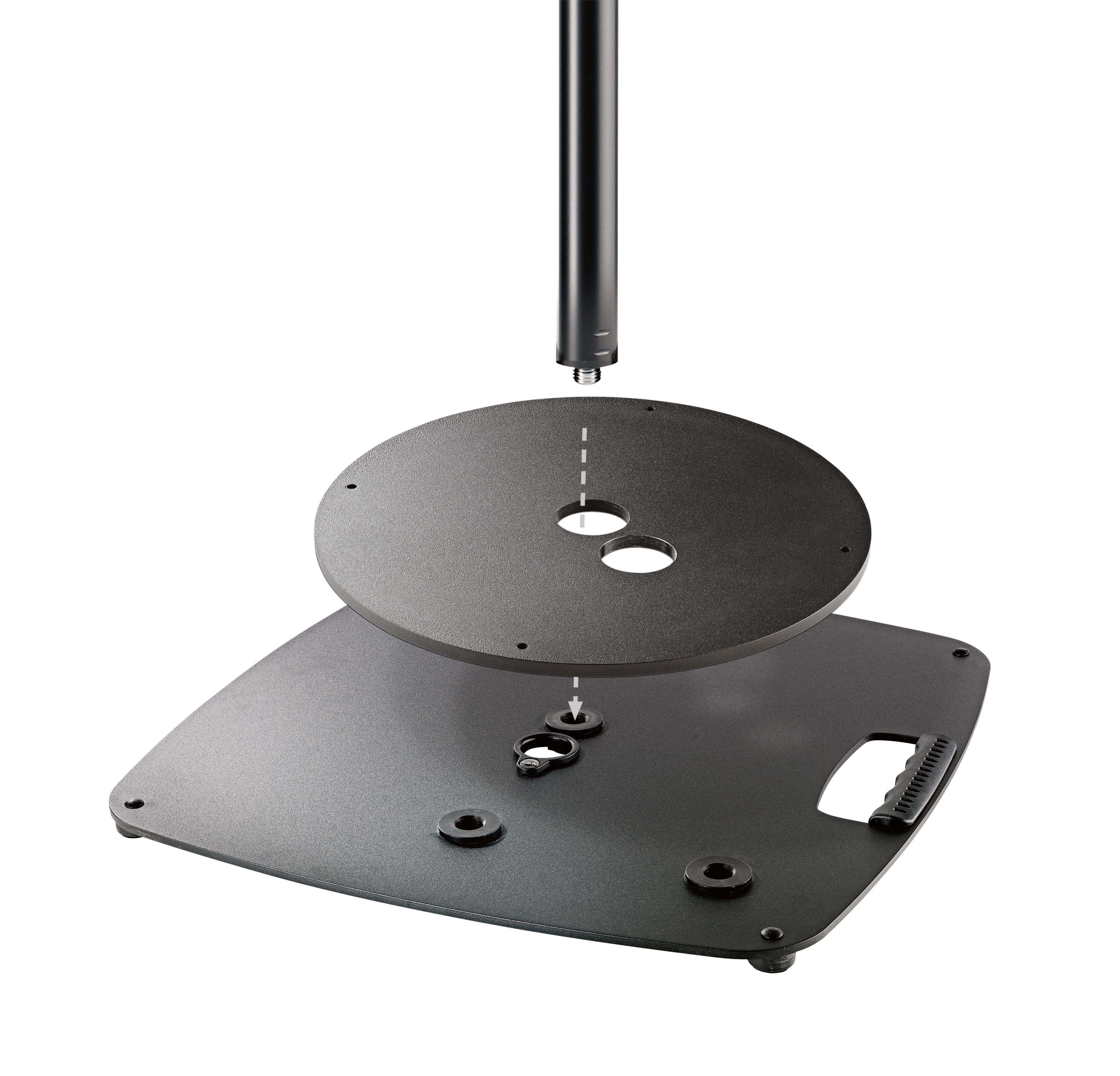 Stojanová deska Samostatné závažie vhodné na maximálnu stabilitu stojanov reproduktorov so základnou doskou M20. Závažie je vyrobené z odolnej ocele a obsahuje dva otvory s priemerom 43,5 mm na inštaláciu na dištančnú tyč stojana reproduktora.