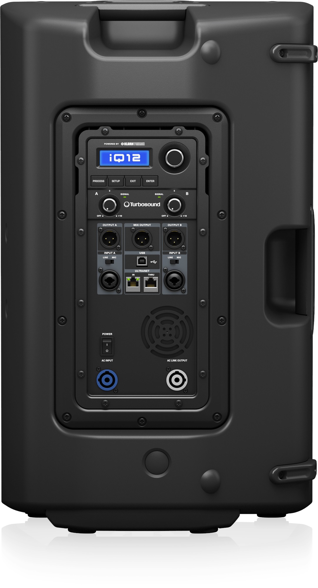 Aktívny reprobox Dvojpásmový aktívny reproduktor Turbosound iQ12 s maximálnym výkonom 2500 W zo zosilňovača triedy D Klark Teknik, digitálny procesor Klark Teknik, frekvenčný rozsah 55 Hz – 20 kHz (-10 dB), maximálny akustický tlak 130 dB, dva kombinované vstupy jack/XLR, výstupy XLR kanálov A a B, výstup XLR Mix, konektory Ultranet (2x RJ45) na pripojenie ku konzolám a digitálnym mixážnym pultom s pripojením Ultranet a port USB (diaľkové ovládanie z PC, aktualizácia firmvéru). Reproduktor možno namontovať