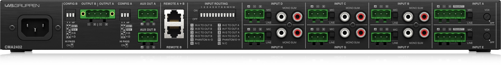 Koncový zosilňovač Lab Gruppen CMA2402 je dvojzónový 8-kanálový vstupný zosilňovač, ktorý je ideálnym riešením pre komerčné a priemyselné aplikácie, ktoré vyžadujú skvelý zvuk v spojení s energeticky úspornými prevádzkovými nákladmi. CA2402 disponuje výkonom 2x 120 W a poskytne skvelý zvuk pre reproduktory vo veľkej reštaurácii, nákupnom centre, hoteli alebo pre firemné a verejné priestory, kde je potrebné spustiť hudbu na pozadí alebo info