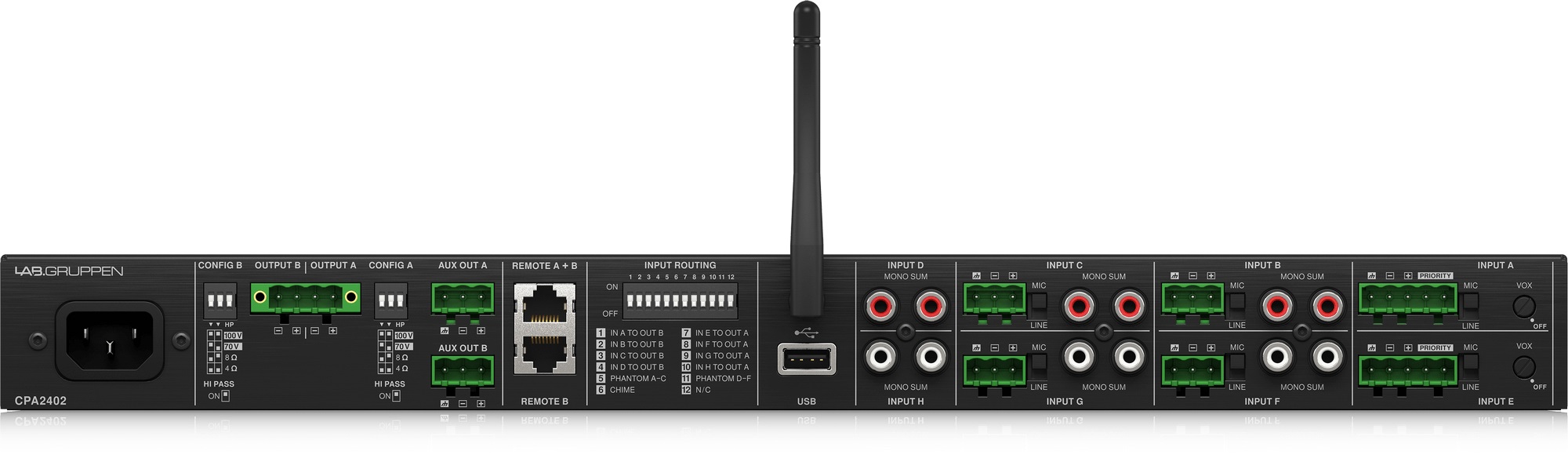 Koncový zosilňovač Lab Gruppen CPA2402 je dvojzónový 8-kanálový vstupný zosilňovač s funkciami prehrávania cez Bluetooth a USB. Je ideálnym riešením pre komerčné a priemyselné aplikácie, ktoré vyžadujú skvelý zvuk v spojení s energeticky úspornými prevádzkovými nákladmi. CPA2402 disponuje výkonom 2x 240 W a poskytne skvelý zvuk pre reproduktory vo veľkej reštaurácii, nákupnom centre, hoteli alebo pre firemné a verejné priestory, kde je potr