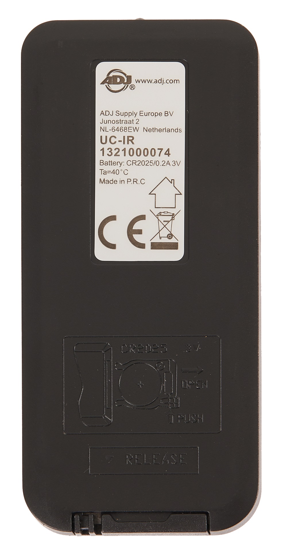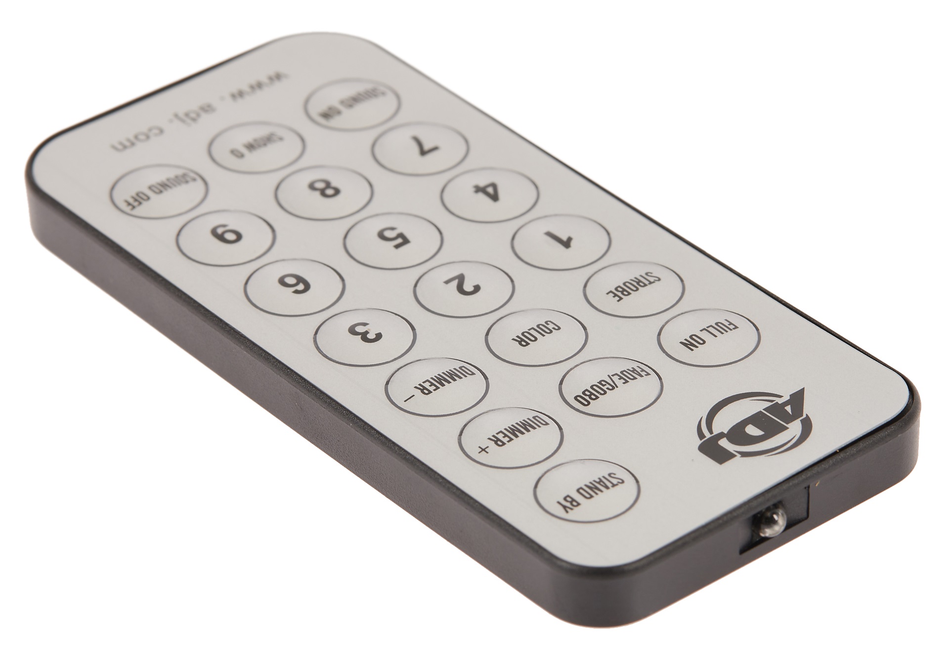 Diaľkový ovládač Univerzálny IR diaľkový ovládač ADJ UC-IR je určený na ovládanie reflektorov značky ADJ a Eliminator, ktoré majú IR funkciu. Umožňuje ovládať rôzne funkcie. Diaľkové ovládanie funguje na vzdialenosť až 9 metrov.
