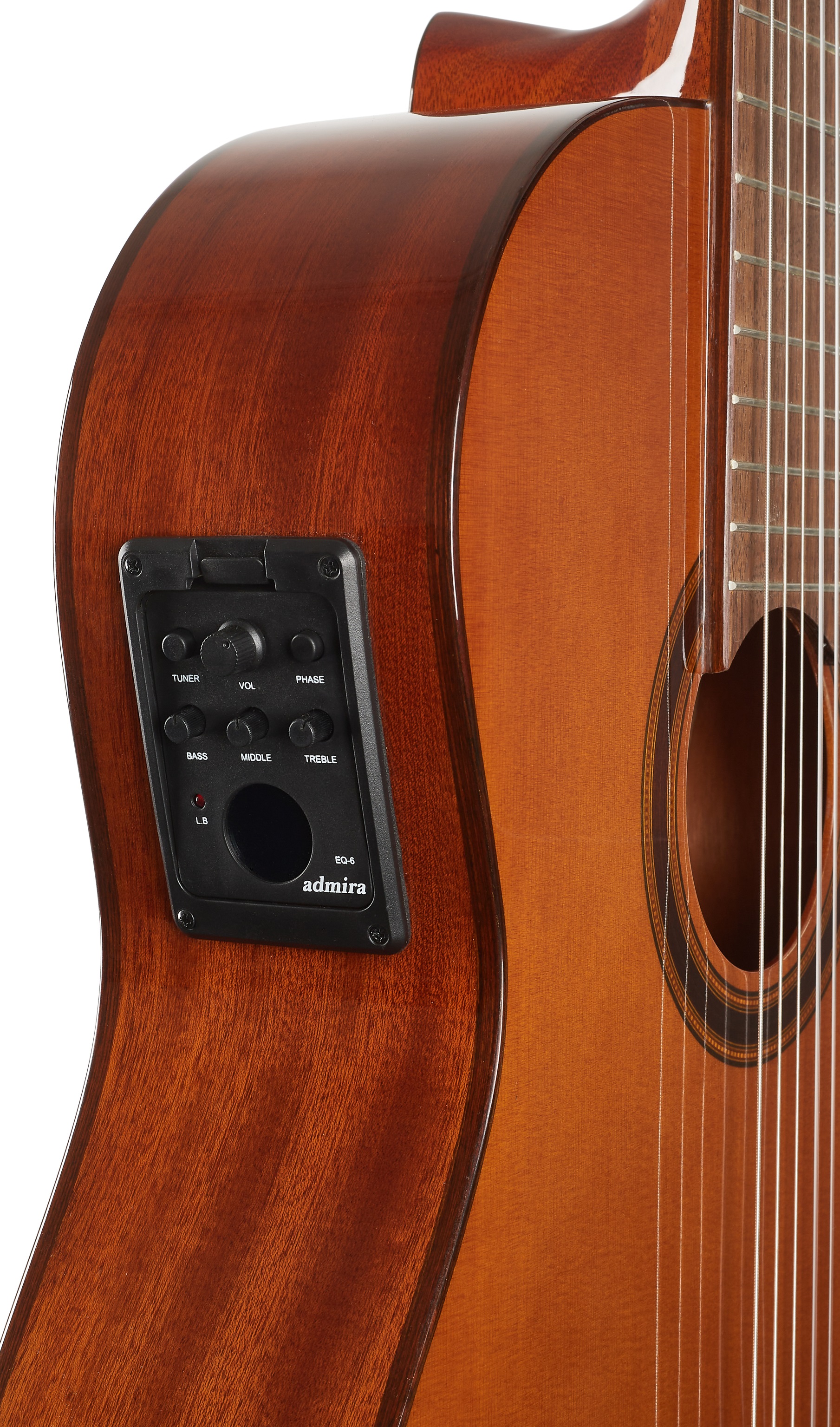 Klasická elektroakustická gitara Admira Málaga (ADM0540EC) je cenovo dostupná klasická elektroakustická gitara, ktorá poteší začiatočníkov aj skúsenejších hráčov. Vyznačuje sa polomasívnou konštrukciou s masívnou cédrovou prednou doskou a laminovanou sapele zadnou doskou a lubmi. Telo je pokryté lesklou lakovou povrchovou úpravou. Ku krku z afrického mahagónu je prilepený hmatník z dreva kabukalli. Nižší výrez tela uľahčuje prístup k vyšším polohám hmatníka. Struny sú osadené v klasických niklových ladiacic