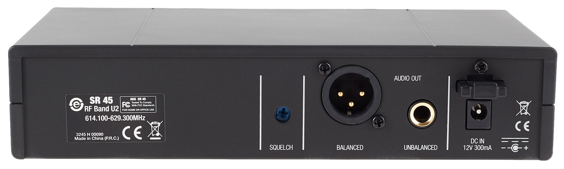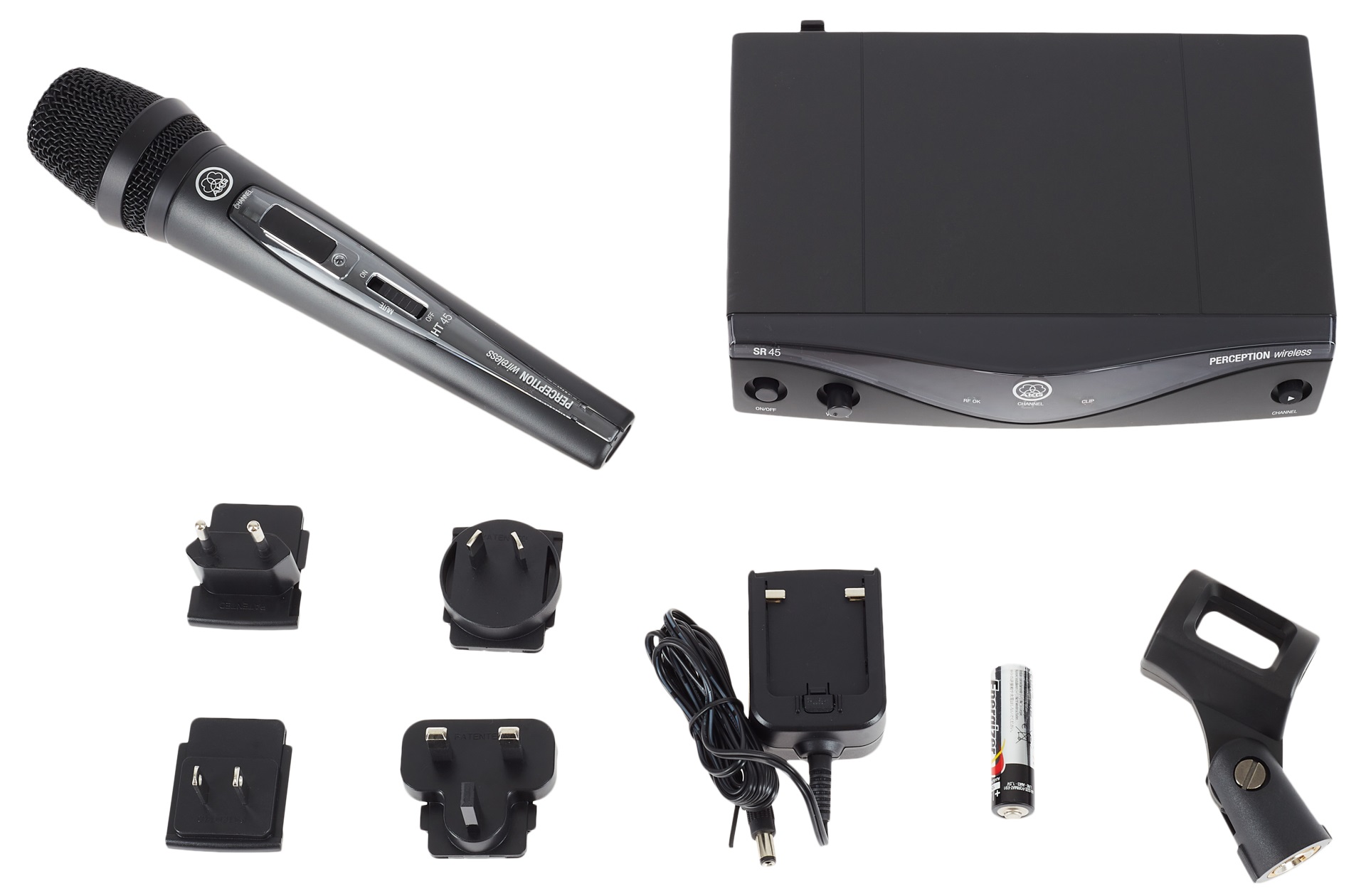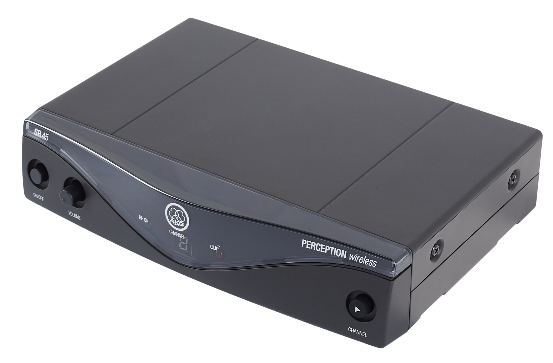 Vokálna bezdrôtová súprava WMS45 Vokálna súprava (SR45, HT45, SA45) bezdrôtová súprava na spev a hovorené slovo. Ako jedna z mála bezdrôtových súprav zachováva prirodzený zvuk hlasu a veľmi ľahko sa používa. Bezdrôtový vokálny set AKG Perception obsahuje prijímač AKG SR45 a ručný mikrofón AKG HT45. Prijímač má na svojom šasi minimálne ovládacie prvky, ale nastavenie parametrov nie je nijako obmedzené. Ovládacie prvky zahŕňajú potenciometer Volume, tlačidlo Channel na prepínanie kanálov, LED displej zobrazuj