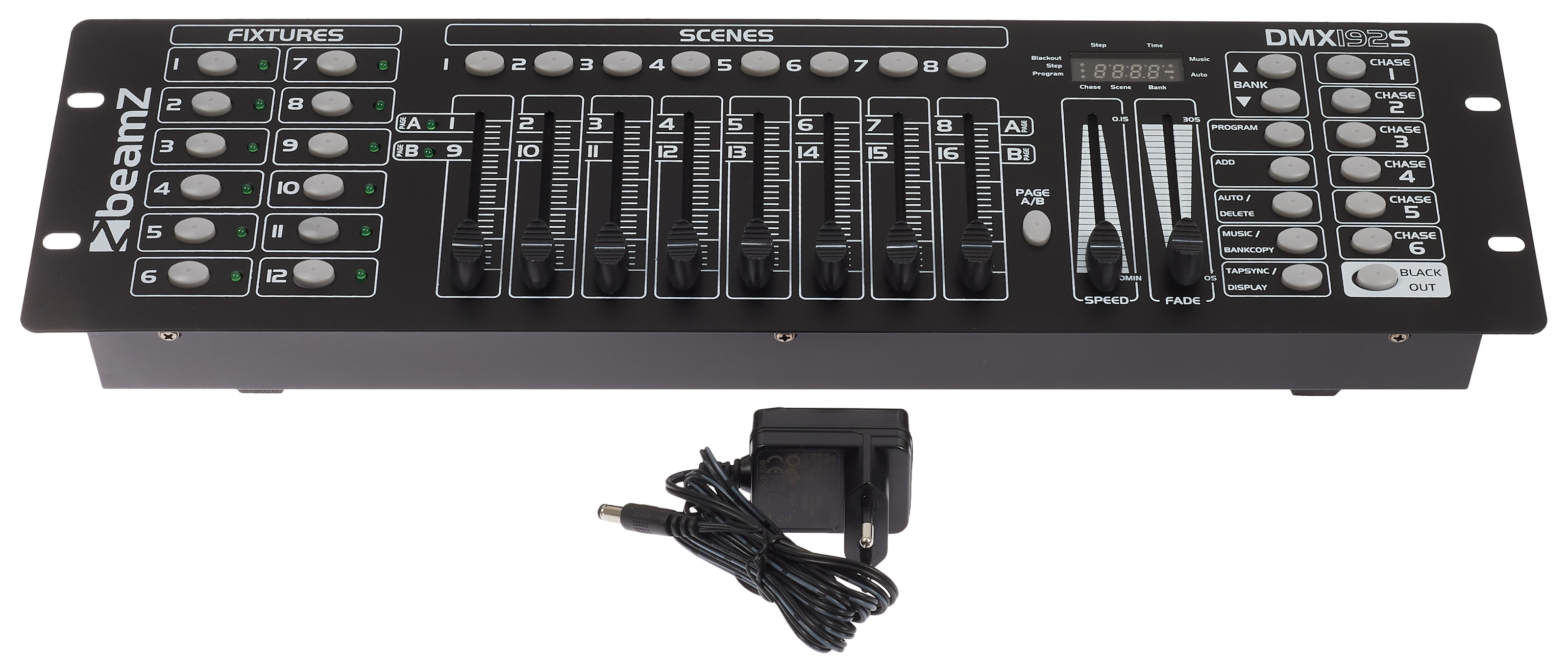 DMX kontrolér DMX-192S od spoločnosti BeamZ je profesionálny ovládač DMX, ktorý ponúka zlatú strednú cestu medzi rozsiahlymi možnosťami ovládania a kompaktnými rozmermi. Je to rackový kontrolér pre 19″ stojany. Zariadenie umožňuje ovládať 12 svietidiel a ovládať až 16 kanálov pre každé svietidlo. Celkovo zvládne 192 kanálov. Okrem toho umožňuje naprogramovať až 240 scén a vytvárať z nich sekvencie alebo chases. K dispozícii je 8 pamäťových bánk pre scény (každá pojme 30 scé