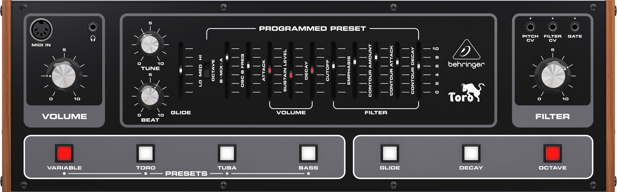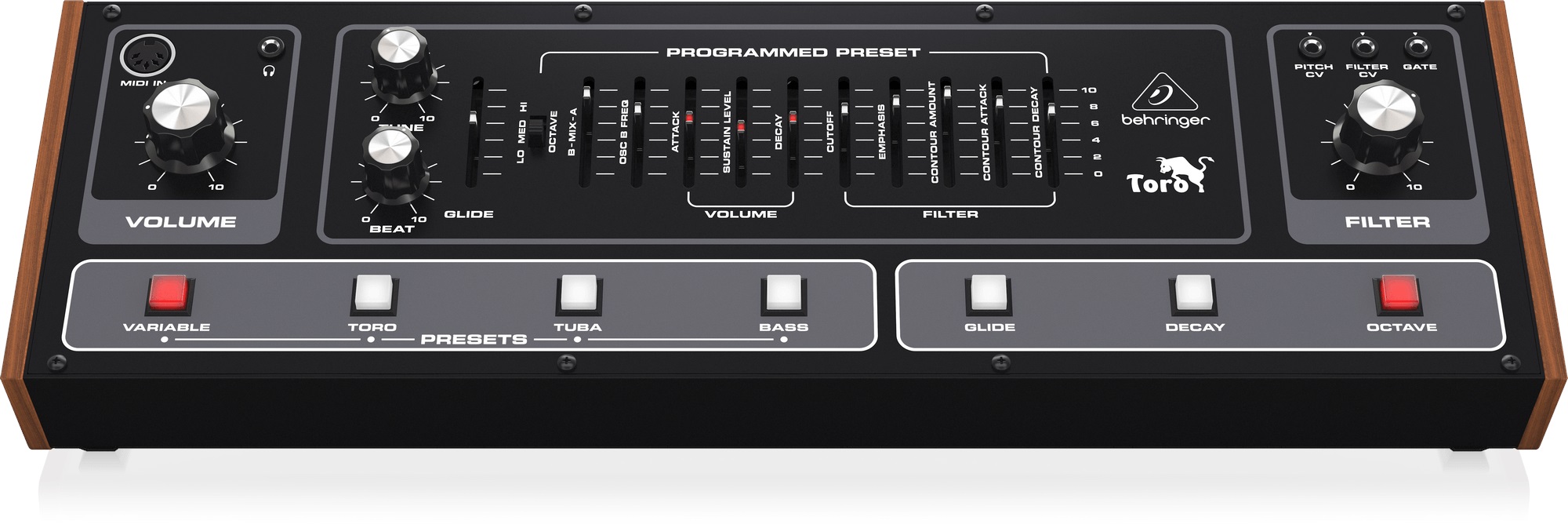 Eurorack modul Behringer Toro je syntetizátor, ktorý sa môže pochváliť dvoma analógovými oscilátormi, z ktorých každý má päťoktávový rozsah a pílový priebeh. Používatelia majú možnosť ovládať ladenie oboch oscilátorov a tiež funkciu ovládania rytmu. Toro ponúka aj dolnopriepustný filter s rezonanciou a nastaviteľnou obálkou attack/decay, čo umožňuje vytvárať bohaté a dynamické zvukové textúry. Syntetizátor navyše obsahuje obálku hlasitosti s parametrami attack, sustain a decay, čo umožňuje detailnejšie ovlá