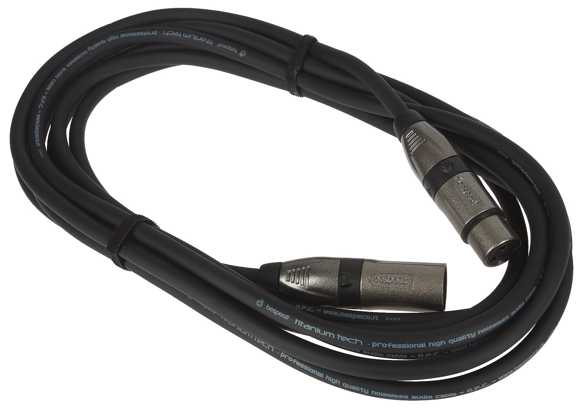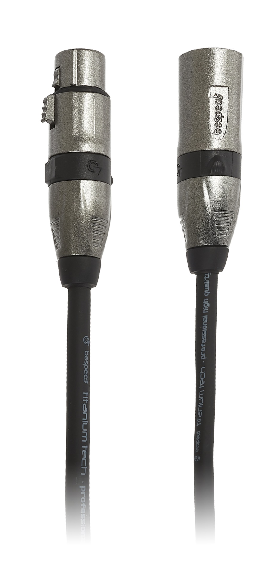 Mikrofónny kábel Bespeco Titanium je rad vysokokvalitných nástrojových a mikrofónových káblov. Zapôsobia nielen svojimi dokonalými zvukovými vlastnosťami, ale aj jedinečným a elegantným dizajnom. Medzi výhody káblov Titanium Tech patrí kompletné pozlátenie konektorov 24-karátovým zlatom, vystuženie vnútorných spojov živicou, priemer kábla 7 milimetrov, pevný a odolný plášť alebo účinné tienenie pokrývajúce 94 % vodiča. Výsledkom je kábel, ktorý je mimoriadne odolný voči mechanickému poškodeniu, takže vydrží