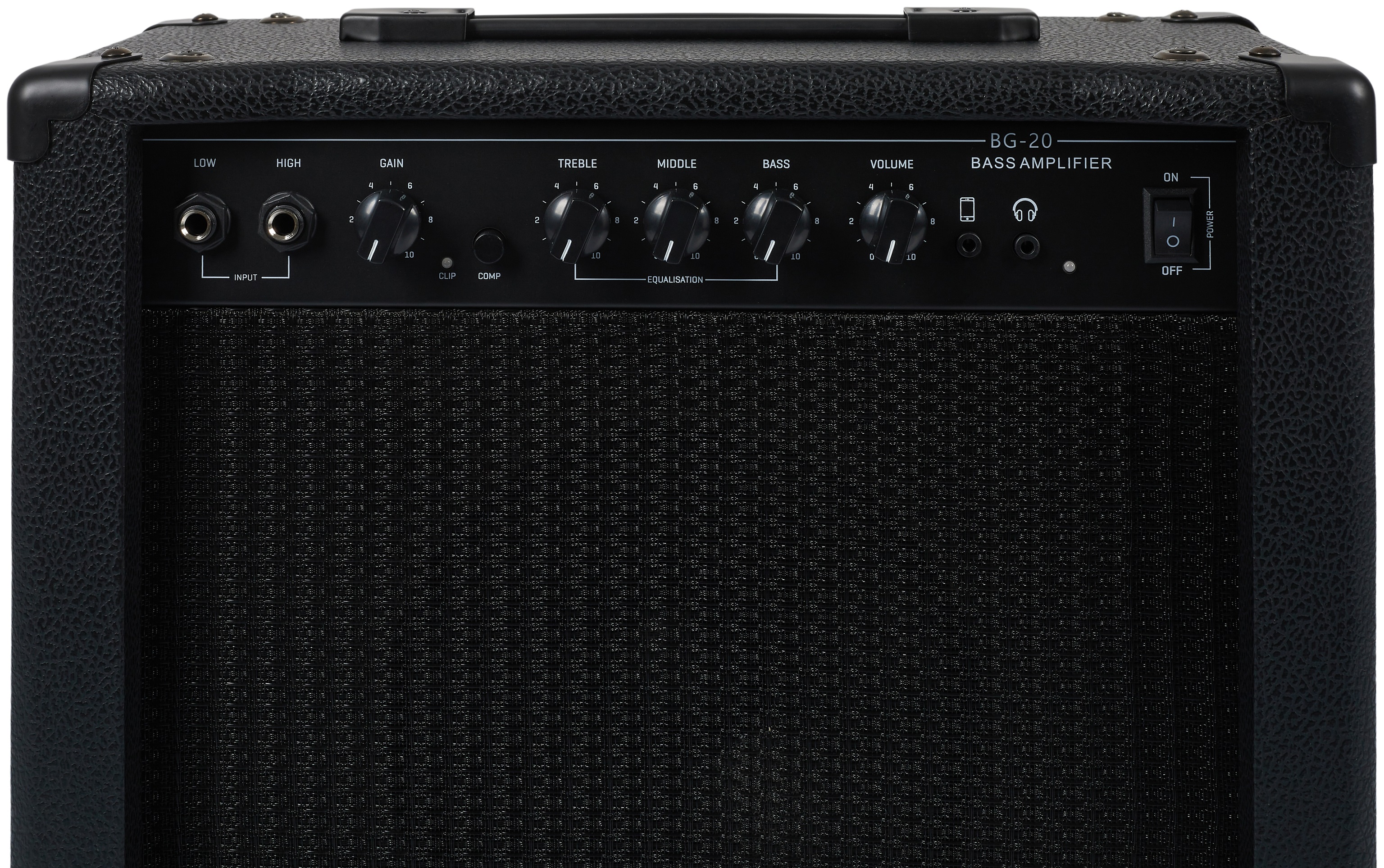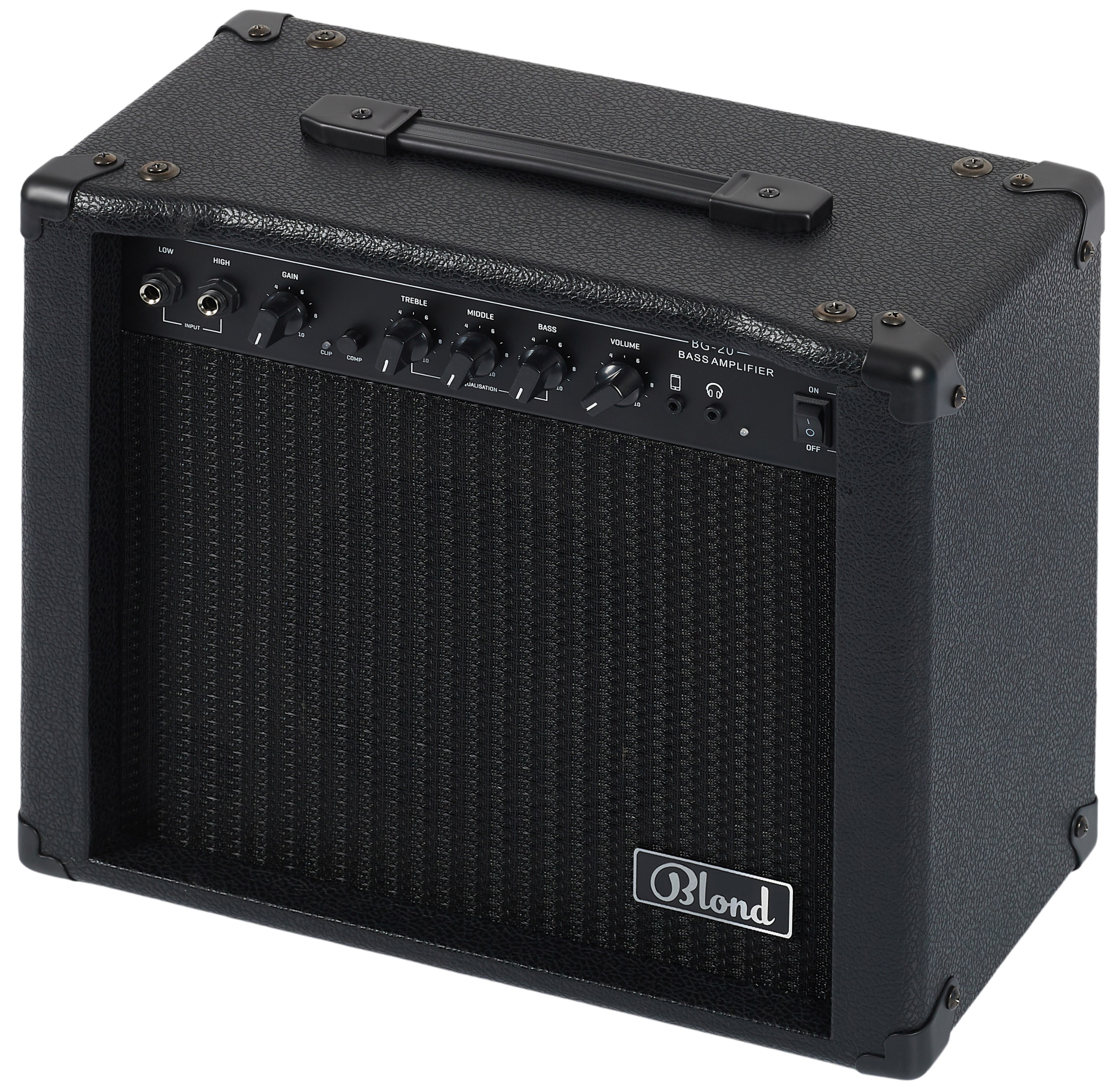 Basgitarové tranzistorové kombo S výkonom 20 W a skvelou cenou je basgitarový tranzistorový kombo Blond BG-20 ideálnym spoločníkom pre začínajúcich basgitaristov. Je vybavený ovládaním zosilnenia predzosilňovača, ovládaním hlavnej hlasitosti, trojpásmovým ekvalizérom, vstavaným kompresorom, výstupom na slúchadlá a aux vstupom pre prehrávanie sprievodných skladieb. S 20 W osempalcovým reproduktorom sa osvedčí v skúšobni aj na vašich prvých koncertoch pre priateľov.